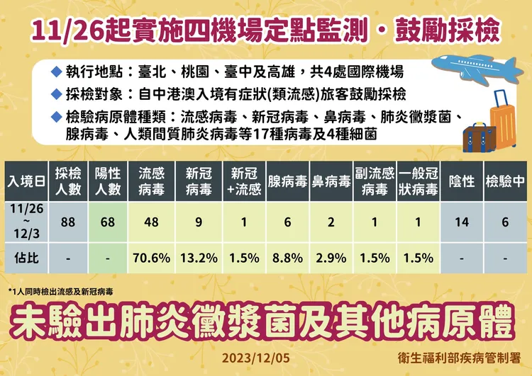 為因應中國近期發生多種呼吸道病毒流行,疾管署自11/26起已實施「定點監測、鼓勵採檢」措施,截至12/4已採檢88人,其中68人為陽性,分別為流感病毒48例、新冠病毒9例、腺病毒6例、鼻病毒2例、副流感病毒及一般冠狀病毒各1例,另1例同時檢出流感病毒及新冠病毒,目前尚未檢出肺炎黴漿菌及其他病原體,仍以流感病毒為多。