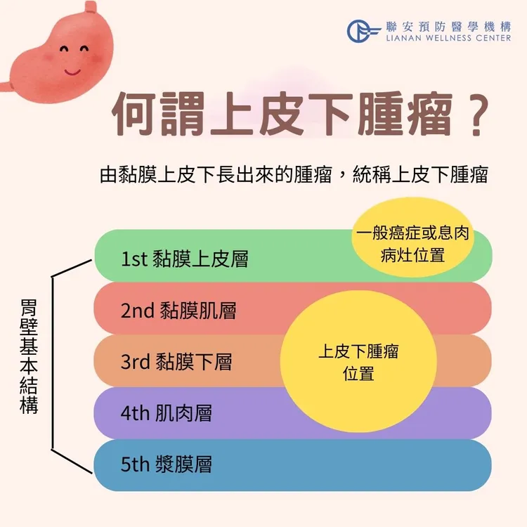 聯安診所內視鏡室主任徐兆甸說明,胃壁可簡單分為五大層,包括黏膜上皮層、黏膜肌層、黏膜下層、肌肉層、漿膜層,常見的息肉、食道癌、胃癌、大腸癌,都是從黏膜層長出來的腫瘤,所以只要不是從黏膜上皮層長出來的腫瘤,就可統稱為上皮下腫瘤。