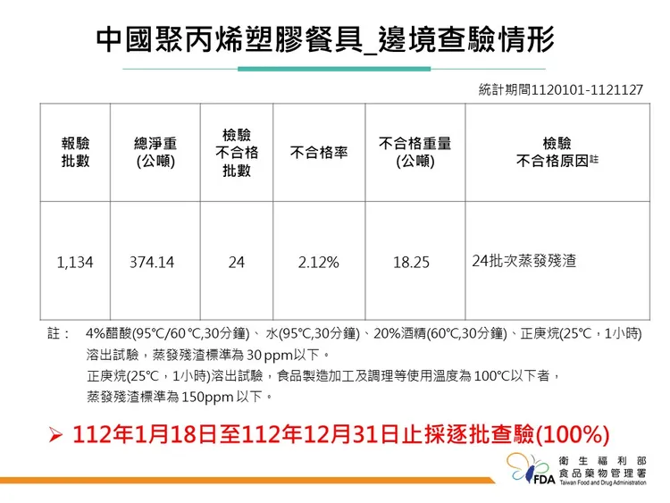 食藥署副署長林金富說明,統計自2023年1月1日至11月27日止,聚丙烯塑膠餐具報驗1134批,其中24批檢出不合格,不合格率為2.12%。食藥署已於2023年1月18日起,對於從中國輸入的聚丙烯塑膠餐具,採100%逐批查驗,這項措施執行到2023年12月31日止,後續會再重新檢討整個管制措施。