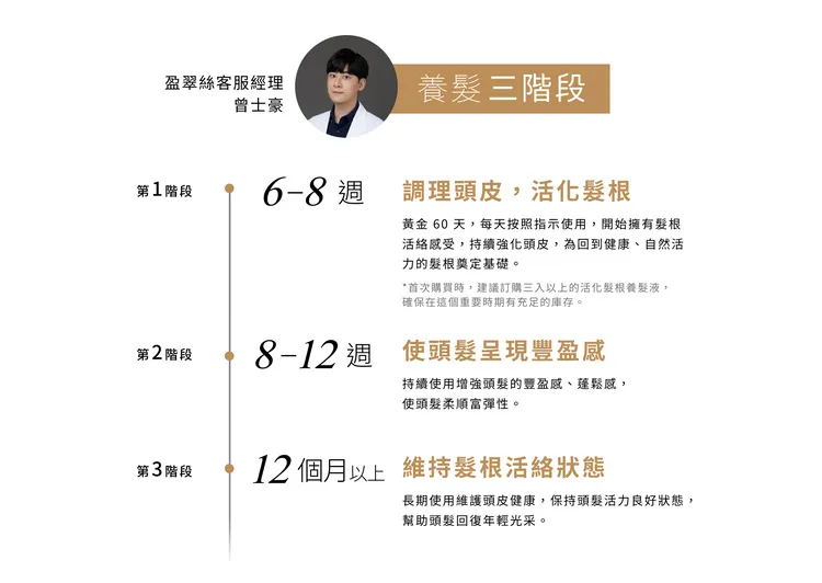 因為有一群有需求的精準粉絲,理科太太團隊對於女性髮況及心態非常了解,通常試過越多方法的使用者,越懂得為自己的新嘗試設立停損點,因此盈翠絲為體貼顧客,整理了盈翠絲養髮三階段。盈翠絲客戶經理曾士豪指出:「第一階段通常在第6-8週就會有感,很多人表示比想像中更快,很期待持續使用後的改變!」