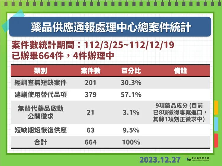 為了及時掌握國內缺藥情形,衛生福利部今年4月成立藥品供應通報處理中心,統計至今年12月19日,已辦理完畢664件缺藥通報案件,其中21件無替代藥品、啟動公開徵求,9項藥品成分中已有8項徵得專案進口,4件辦理中。