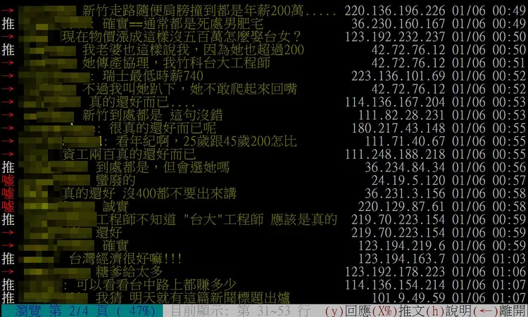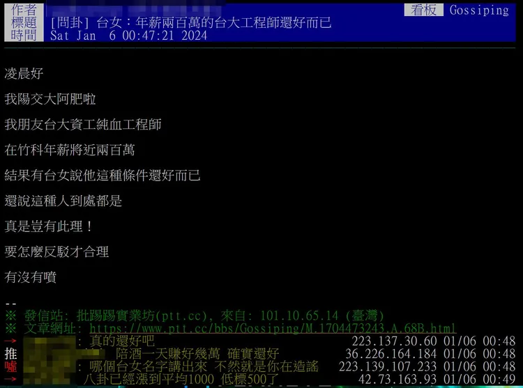 一名網友在《台大批踢踢》實業坊問卦「台女:年薪兩百萬的台大工程師還好而已」,他表示朋友台大資工純血工程師,在竹科年薪將近兩百萬,結果有台女說他這種條件還好而已,還說這種人到處都是。他寫道:「真是豈有此理!要怎麼反駁才合理,有沒有噴!」