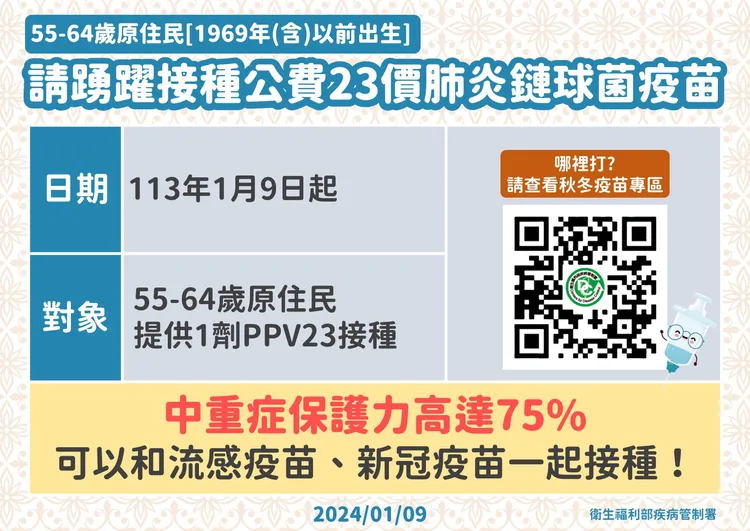 秋冬為呼吸道傳染病好發季節,為避免55-64歲原住民發生侵襲性肺炎鏈球菌感染症(IPD)風險,及降低感染後併發重症及死亡機率,衛生福利部傳染病防治諮詢會預防接種組(ACIP)於2023年11月22日專家會議討論決議,建議將55-64歲原住民[1969年(含)以前出生]納入公費23價肺炎鏈球菌疫苗(PPV23)實施對象,