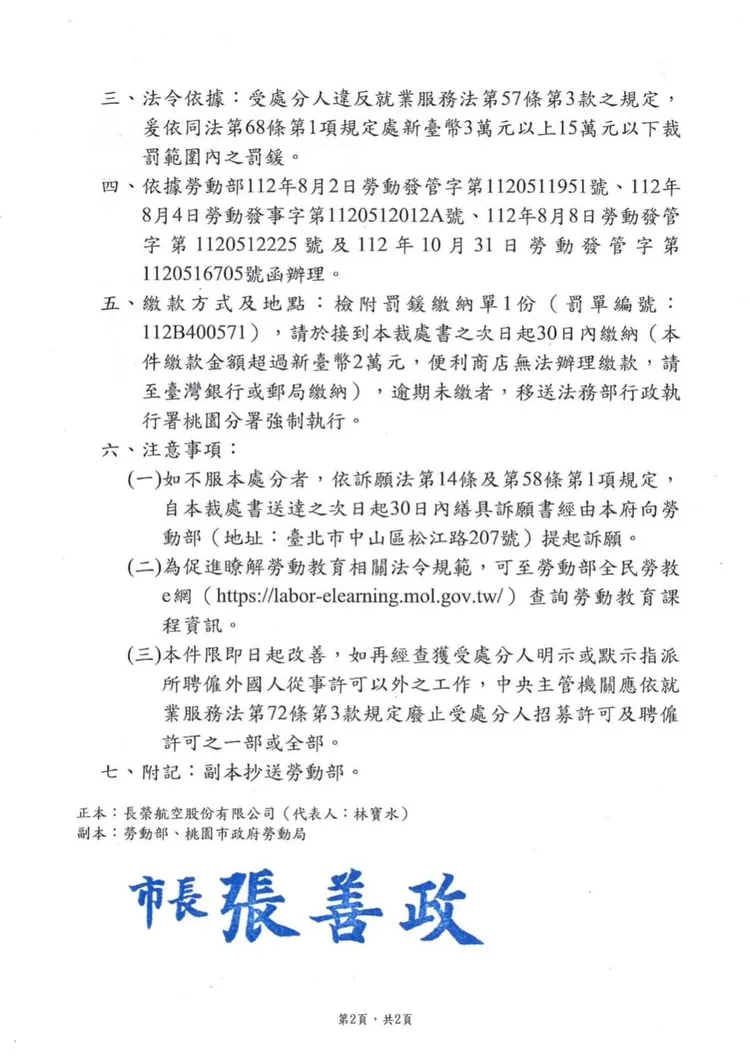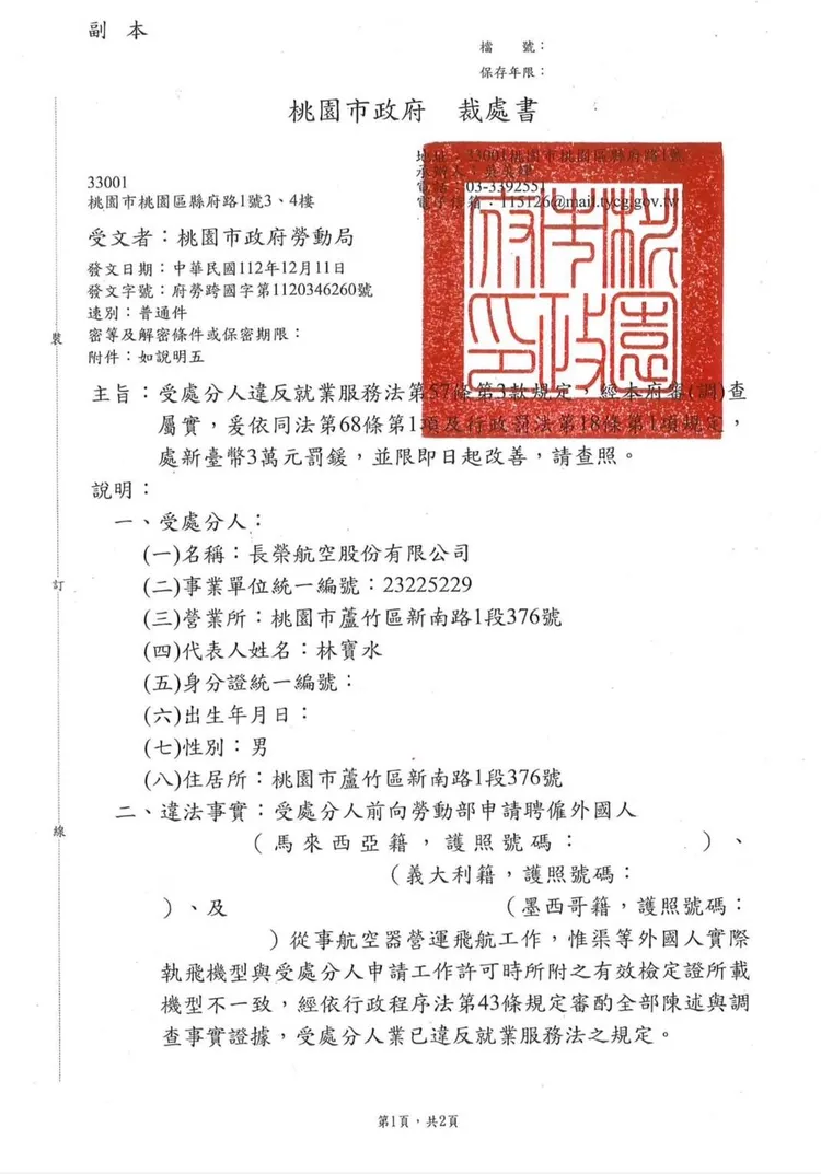 機師工會今日秀出桃園市政府裁處書,揭示長榮航空因違法進用沒有特定機型執照的外籍飛行員,明確違反《就業服務法》第68條,在去年12月上旬,遭到桃園市勞動局具體裁罰,並要求即日改善,否則可廢止招募許可及聘雇許可之一部或全部。