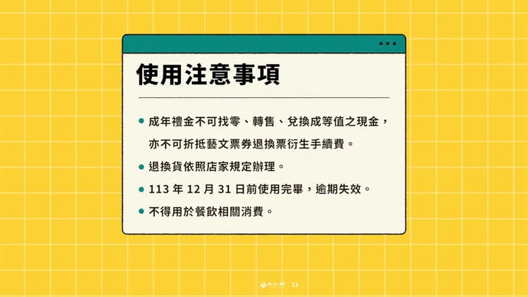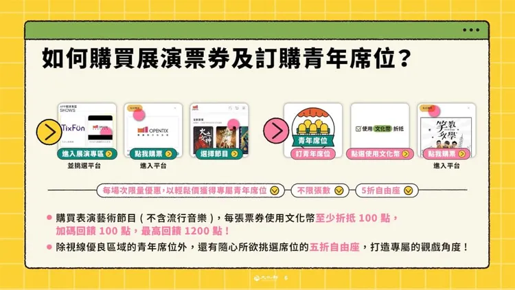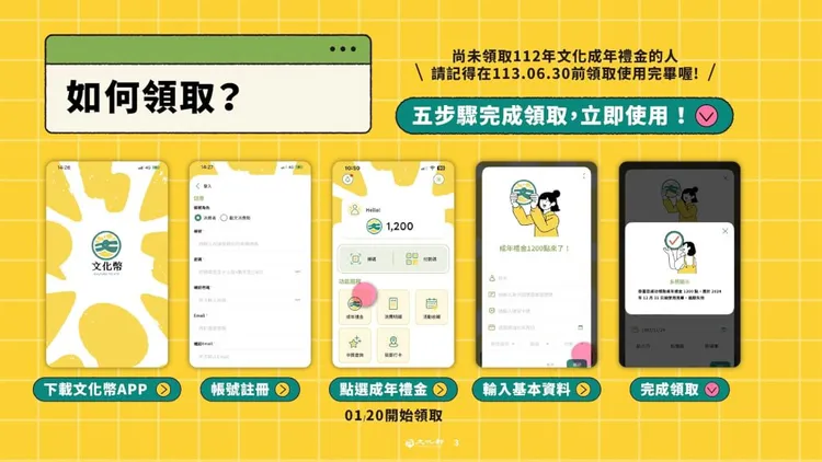 文化部針對16歲到22歲青年,每人發放1200點文化幣,1點等於新台幣1元,可用於看表演、看展覽、看國片、買書、買文創或工藝品等藝文消費折抵,領取使用期間自113年1月20日至113年12月31日止。