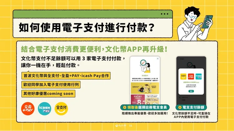 其中買國片電影票優惠只要掃描電影院QRCode,再選擇國片並輸入文化幣金額完成折抵;國片專區找到想看的國片,選「文化幣購買電影票」並輸入想使用的文化幣金額,出示QRCode給電影院掃描即完成折抵。