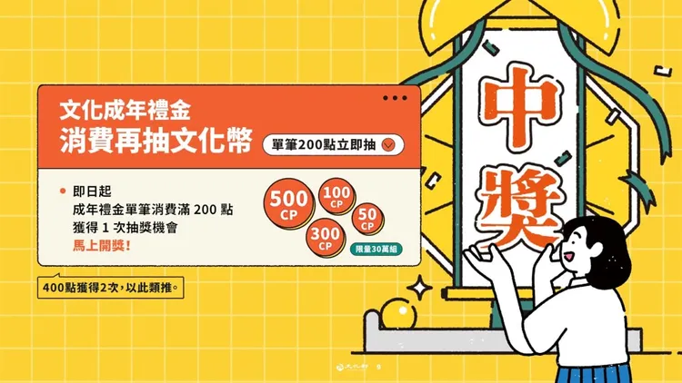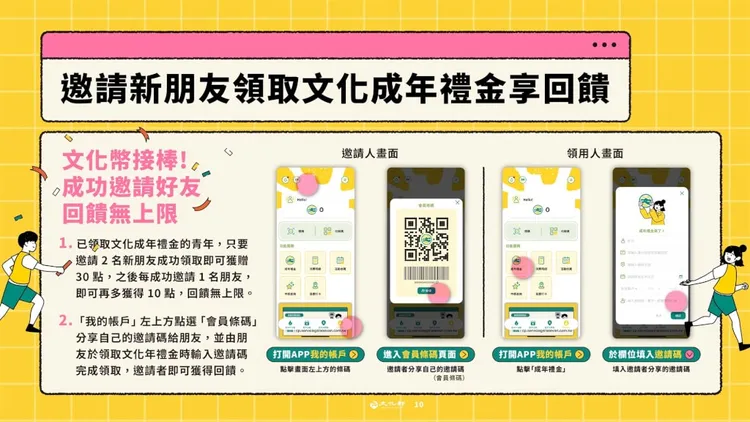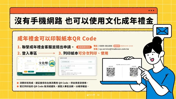 文化部發布新聞稿表示,今年約有150萬名16歲到22歲青年具領用資格。此外,去年18歲到21歲成年禮金也可持續使用到6月30日。即便沒有手機、網路也可使用文化成年禮金,只要聯繫客服提出申請紙本QR-code,申請通過後,在指定網頁登入印出紙本QR-code帶至藝文消費點使用。