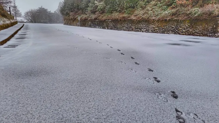 「大雪山國家森林遊樂區」臉書粉專除了今早PO出雪花紛飛美景照,昨天還在粉專發文說,「最近凌晨時,49k小雪山資訊站部分路面就已有結霜的現象,連山羌都要小心路滑~」,並貼出幼小山羌在結霜染白路面緩緩獨行的夢幻畫面,網友朝聖全看呆。