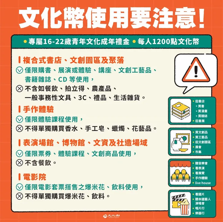 A:文化成年禮金可用於藝文展演及文化體驗、圖書、視聽娛樂、文創工藝等類型,例如看國片、看表演、購書、逛博物館、買文創等藝文消費。