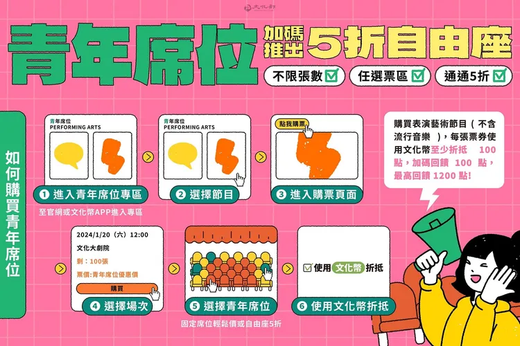 A:表演藝術(不含流行音樂)青年席位優惠方案,包含視線優良區域但價格易於入手的專屬「青年席位」,以及可自由選位的「5折自由座」,每場次限量優惠,購票不限張數,但須以文化幣折抵至少100點。每張票券折抵100點,再送100點,最高可送1200點。