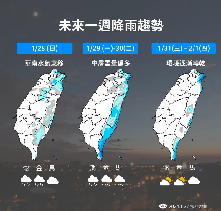 明顯轉乾會是在週三(1/31)過後,週三過後只有偏東風的影響,東半部跟恆春半島有局部短暫雨,其他地方是多雲到晴。週一過後,溫度一天比一天高,週三各地高溫度至少25°C左右,南部可能接近28°C,南部近山區甚至可能接近30°C。