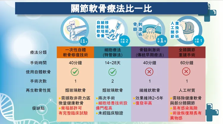 陳暐錚表示,一次性自體軟骨修復術屬於自費微創手術,只需經由膝關節兩側各一個1至2公分的傷口,分別從患者自體不需受力處取出微量健康軟骨,不需耗時培養,在手術室中以特殊酵素活化切碎後,立刻可以植回受傷部位,且植入之軟骨隨著時間,逐漸生長成與人體軟骨相近的「類透明軟骨」,術後可以刺激軟骨生成的復健活動輔助。