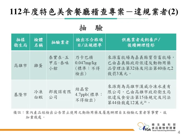 食藥署聯合地方政府衛生局啟動「2023年度特色美食餐廳稽查專案」,針對相關餐飲業者進行稽查,查核食品業者登錄、產品責任險、環境及人員衛生等,共計206家,今日公布執行結果,其中2件食材(冷凍白蝦及雞蛋)檢出動物用藥殘留與規定不符。