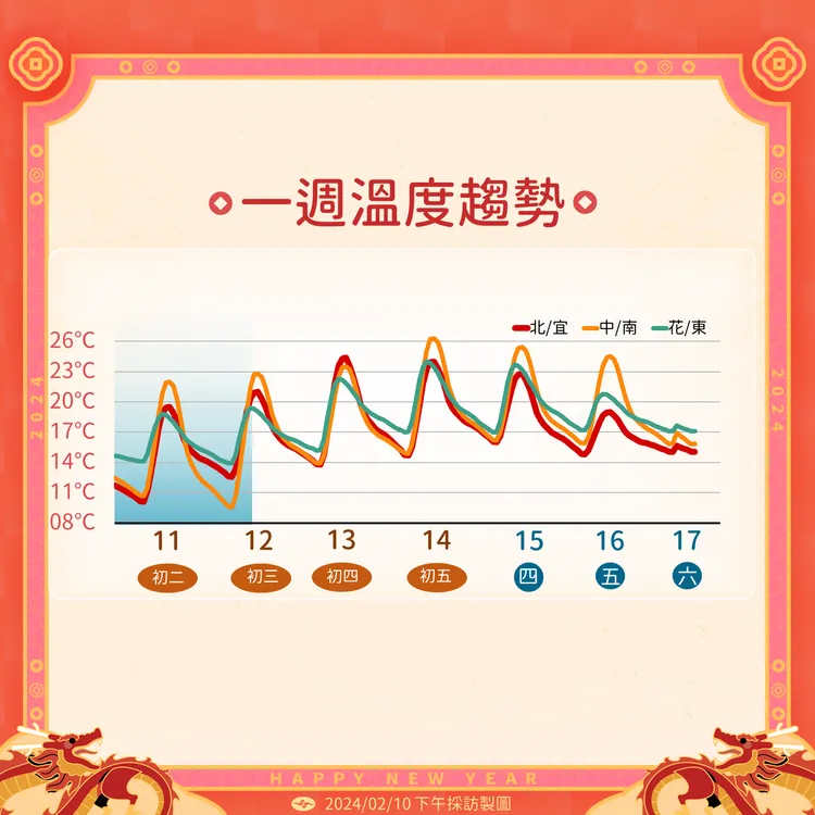 中央大學大氣系兼任副教授吳德榮在「三立準氣象·老大洩天機」專欄撰文指出,最新(10日20時)歐洲(ECMWF)模式模擬顯示,年初二(11日)白天起至週四(初六15日),受「大陸高壓」東移影響,各地都是晴朗穩定的天氣;冷空氣逐日減弱,白天在陽光下逐日回暖,入夜「強輻射冷卻」氣溫降,日夜溫差很大,早晚應注意保暖。今日各地區氣溫:北部5至215˚C,中部8至23˚C,南部10至25˚C,東部9至23˚C。年初三、四的清晨仍有10˚C以下的平地最低氣溫,時間都很短,天亮迅速回升。