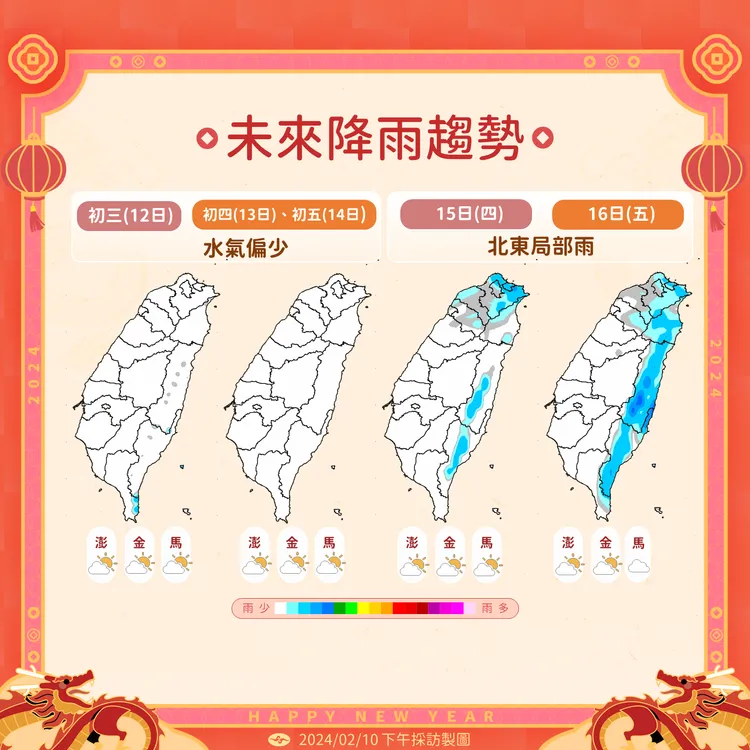 最新模式模擬顯示,週五(初七16日)有一小股東北季風南下,迎風面雲量略增,北海岸、東半部轉有局部短暫雨的機率,北台略轉涼,其他地區影帶小。週六(17日)東北季風減弱,天氣好轉、氣溫回升。
