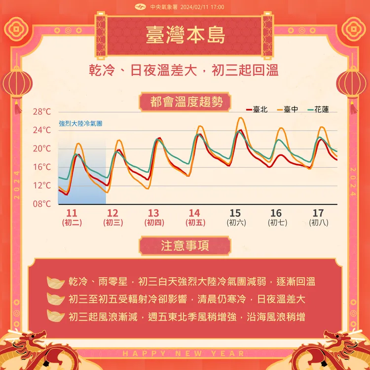最新(11日20時)歐洲(ECMWF)模式模擬顯示,年初三(12日)白天起至週四(初六15日),受「大陸高壓」東移影響,各地都是晴朗穩定的天氣;冷空氣逐日減弱,白天在陽光下逐日回暖,入夜「強輻射冷卻」氣溫降,日夜溫差很大,早晚應注意保暖。今日各地區氣溫:北部6至23°C,中部6至26°C,南部7至27°C,東部9至25°C。年初四、五清晨部分平地仍有10°C以下的「輻射低溫」,時間很短暫,天亮迅速回升。