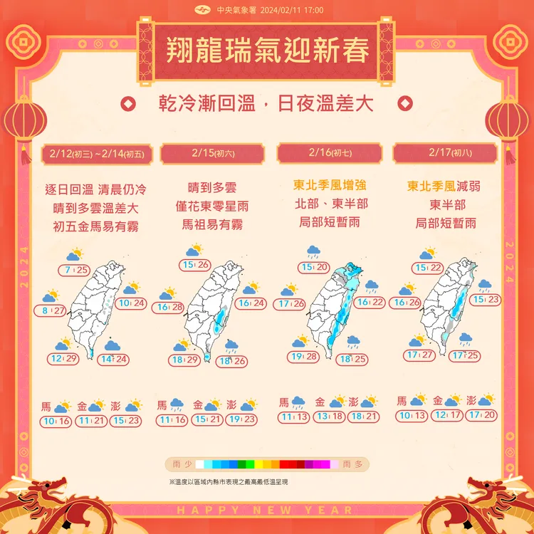 大年初四至初六(13日至15日)輻射冷卻影響清晨氣溫仍偏低,留意日夜溫差相當大;各地為晴到多雲,僅東部及東南部有零星短暫雨。