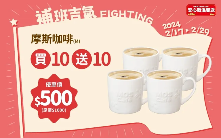 摩斯漢堡針對開工後的第一個補班日2/17,祭出咖啡優惠,全台門市「中杯摩斯咖啡買一送一」,MOS Order APP「安心取溫馨送」更加碼推出「中杯摩斯咖啡買10送10」,優惠價500元,限量1000組,濃醇咖啡,帶著柑橘果香。