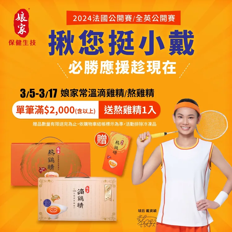 娘家揪您挺小戴,必勝應援趁現在!「娘家滴/熬雞精」的優點,不只球后喜愛,一直以來也受到許多消費者們的肯定!娘家也邀請粉絲們一同應援小戴在比賽中能獲得好成績,至3月17日前到娘家官網消費單筆買「娘家常溫滴雞精/熬雞精」$2,000(含以上),就送熬雞精1入(這裡買: https://www.ftvmall.com.tw/link/724/)。想增強體力的朋友們,快跟著世界球后的養身祕方,一起養出健康好體質吧!