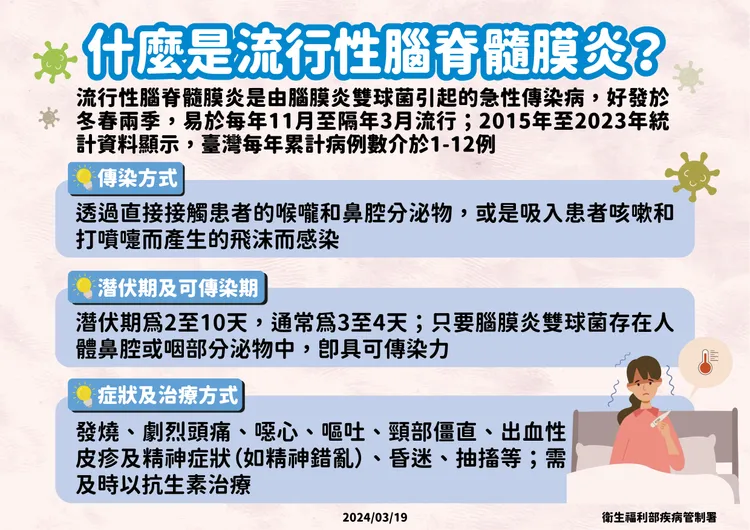 疾管署說,免疫低下者較容易致病,其潛伏期約2~10天,主要症狀為發燒、劇烈頭痛、頸部僵直、噁心、嘔吐、出血性皮疹等,有時也會出現昏迷和譫妄等症狀,嚴重時甚至休克死亡,需及時給予抗生素治療。