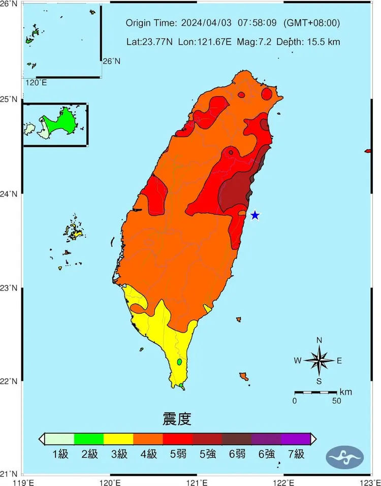 今晨7:58分花蓮縣政府南南東方25公里,台灣東部海域發生芮氏規模7.2地震,地震深度15.5公里屬極淺層地震,最大震度6級。08:11花蓮再發生強烈地震,規模6.5,深度僅5.5公里,最大震度5強。