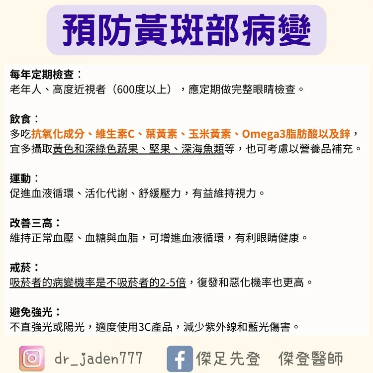 傑登醫師在臉書提到有關黃斑部病變的危險因子,包括年齡、遺傳、吸菸、肥胖、常接觸強光且防護不足、高度近視。