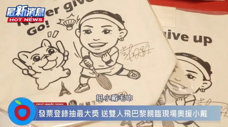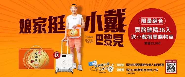 娘家更以實際行動奧援小戴,「娘家挺小戴 巴黎見」特別推出熬雞精36入「小戴聯名摺疊購物車組」、熬雞精12入「奧援限量禮盒」(此為家樂福獨家販售,預計4月底上市);更與臉書粉絲超過50萬的知名插畫家可布魯「豆卡頻道」聯名推出「挺小戴小袋」、「挺小戴毛巾」。最大獎則是買娘家及消費高手全商品滿$699,就月月抽台北飛巴黎來回雙人機票(價值新台幣15萬),抽中的幸運兒就可揪伴飛往巴黎到奧運現場為小戴加油。