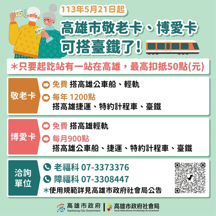 社會局表示,為鼓勵長輩及身障者多多外出活動及減少自駕風險,高雄市敬老卡、博愛卡可搭乘多元運具。市府並積極與國營臺灣鐵路股份有限公司商討建置高雄社福卡專用模組,提供多一種交通選擇。目前臺鐵票卡系統已建置完成,並經測試通過,自113年5月21日起高雄敬老卡及博愛卡社福點數可搭乘臺鐵列車每趟次最高扣抵50點(元),點數用畢仍有半價優惠。