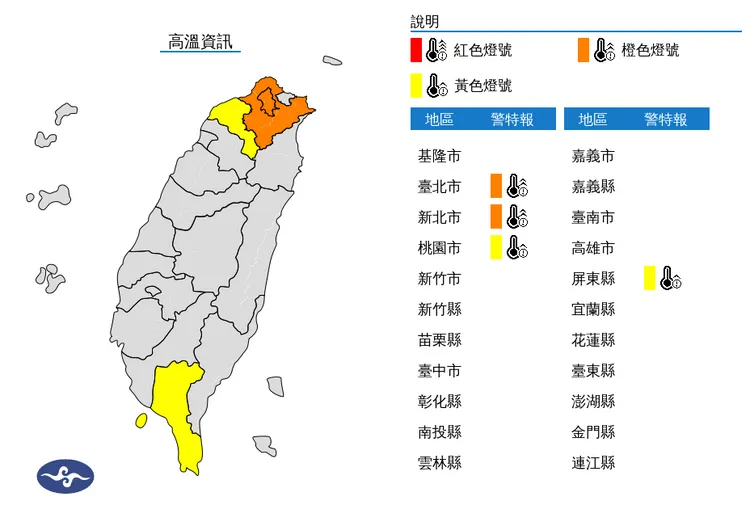 天氣高溫炎熱,中央氣象署今日中午前後針對4縣市發布高溫資訊,其中台北市、新北市為橙色燈號,有連續出現36℃高溫機率,另桃園市、屏東縣為黃色燈號,請加強請注意。