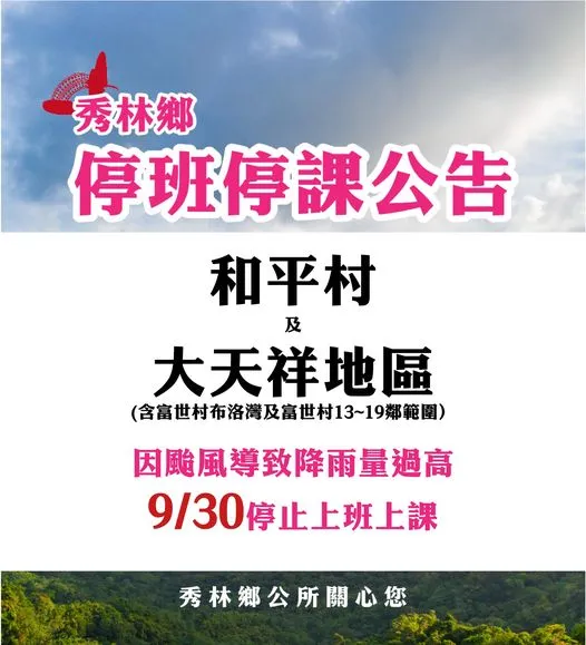 秀林鄉和平村及大天祥地區(含富世村布洛灣及富世村13~19鄰範圍)停止上班、停止上課。
