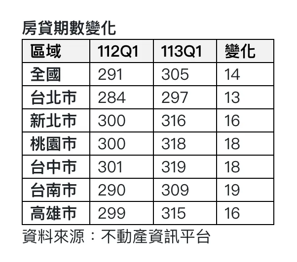 本季新增購置住宅貸款平均貸款期數包括新北市平均316個月,桃園市的318個月,台中市的319個月,平均房貸年數都超過26年,使用30年期的房貸比例明顯拉高,成為當前市場的房貸主流,連過去房貸期數最少的台北市,也寫下297個月的新高。
