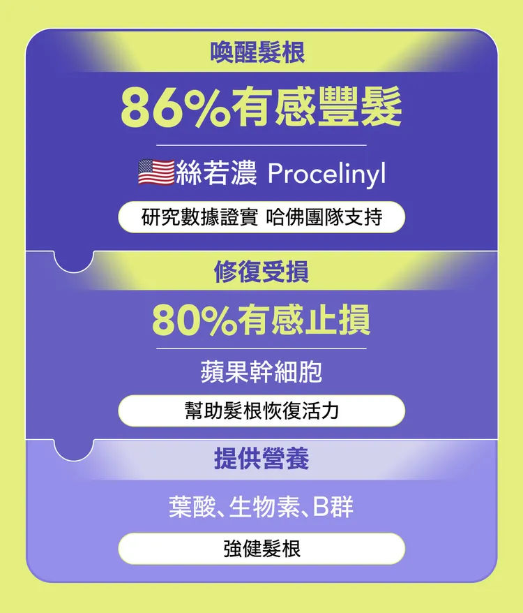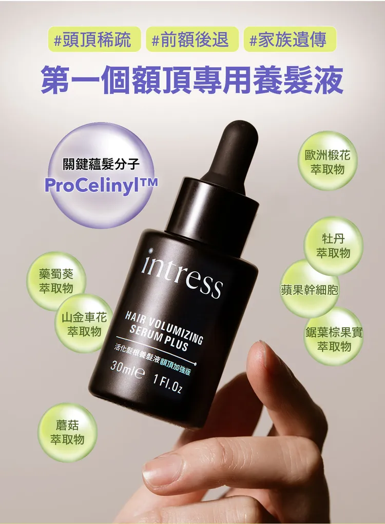從美國紅到台灣的 intress 盈翠絲養髮液獨家成分 ProCelinyl™ 絲若濃,獲得皮膚科診所院長、醫美診所院長、婦產科主治醫師聯合推薦,安全有感無庸置疑,原因除了 ProCelinyl™ 絲若濃能為髮況「開源」,intress 盈翠絲更協同為頭髮「節流」成分:維生素B1、B2、B3、B6、B12,維生素B9(葉酸)提供頭皮營養;維生素B5(泛酸)維持頭髮光澤,維生素B7(生物性)健康頭皮生態,維生素B8(肌醇)賦活髮根青春。「 EX PLUS 額頂加強版」活化髮根養髮液更協作了的蘋果幹細胞,賦活頭皮活力,解決家族髮量困擾。
