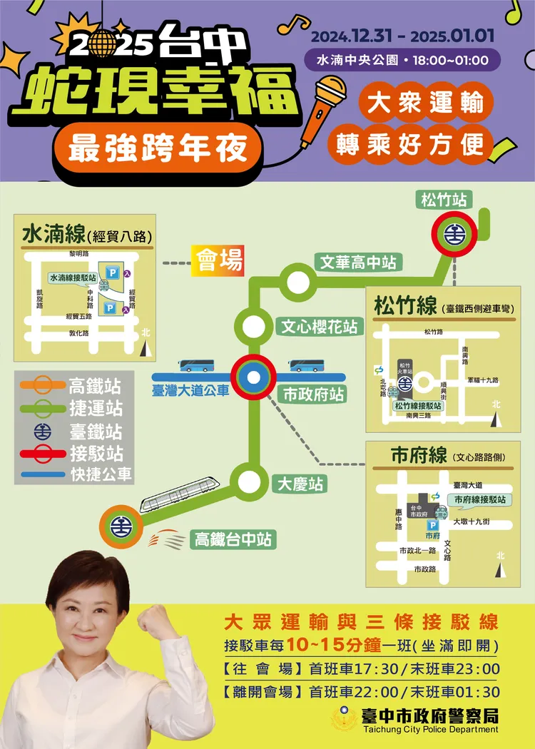 台中市政府規劃跨年晚會免費接駁車,計有市府線、松竹線及水湳線等3條接駁線,接駁車進入會場接駁時間為31日17時30分至23時;離開會場接駁時間為31日22時至翌日1時30分,各線均每隔10至15分鐘1班,坐滿或時間到即發車,路線及建議搭乘規劃如下: