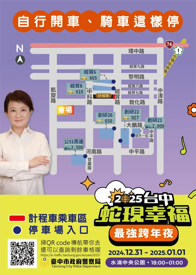 會場中央公園周邊汽車停車場計有經貿6、經貿8、公138、創研22、創研26、中央公園、公51等停車場,其中經貿6、經貿8停車場有免費接駁車,接送民眾至會場。機車停車區計有公138、創研21、公51等停車場。因停車空間有限,請民眾出發前先上「臺中市停車導引系統」網站(https://e-traffic.taichung.gov.tw/year2025/)或掃QR code,即可查詢活動會場周邊停車場剩餘車格資訊,若已無停車空間,請民眾轉乘大眾運輸工具前往會場,省時又便利!