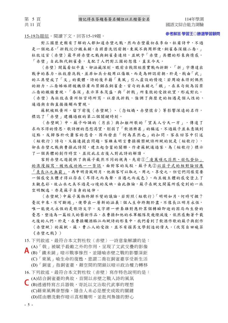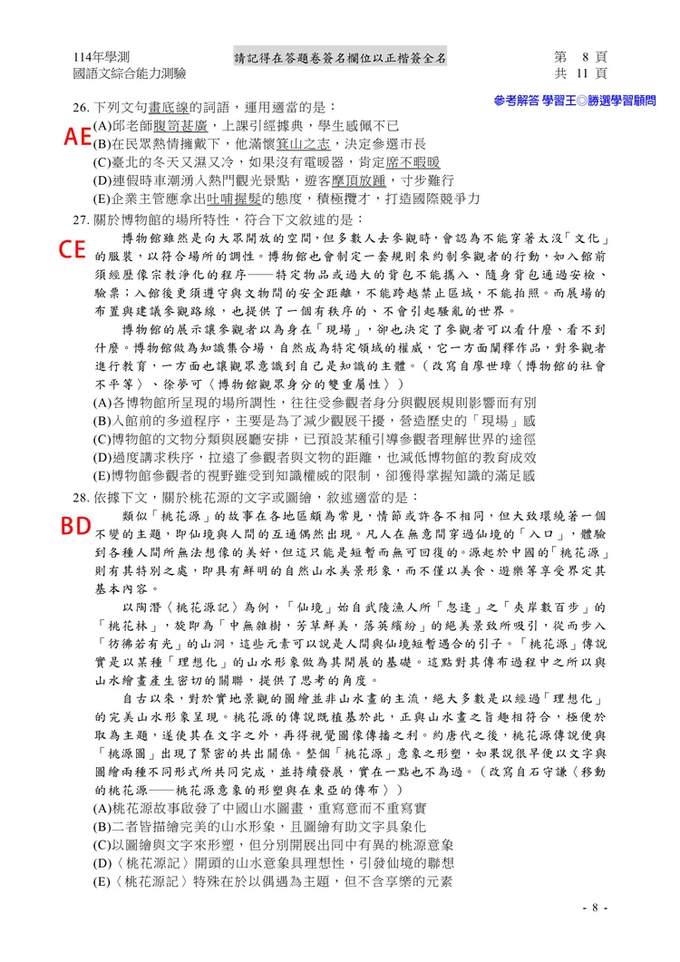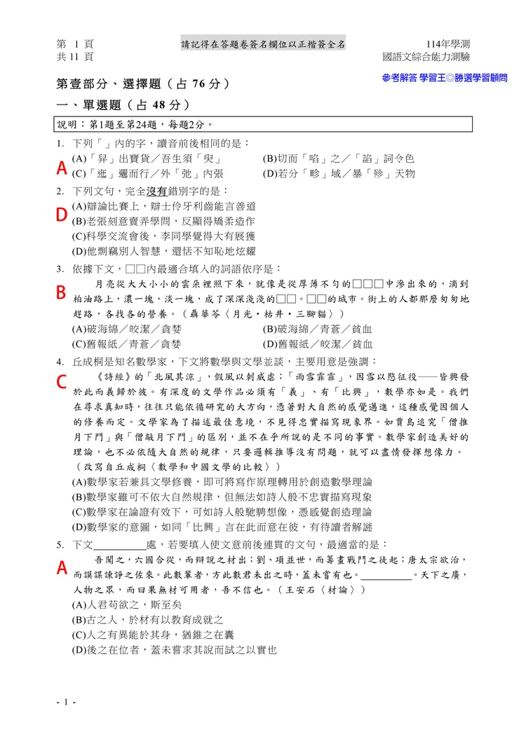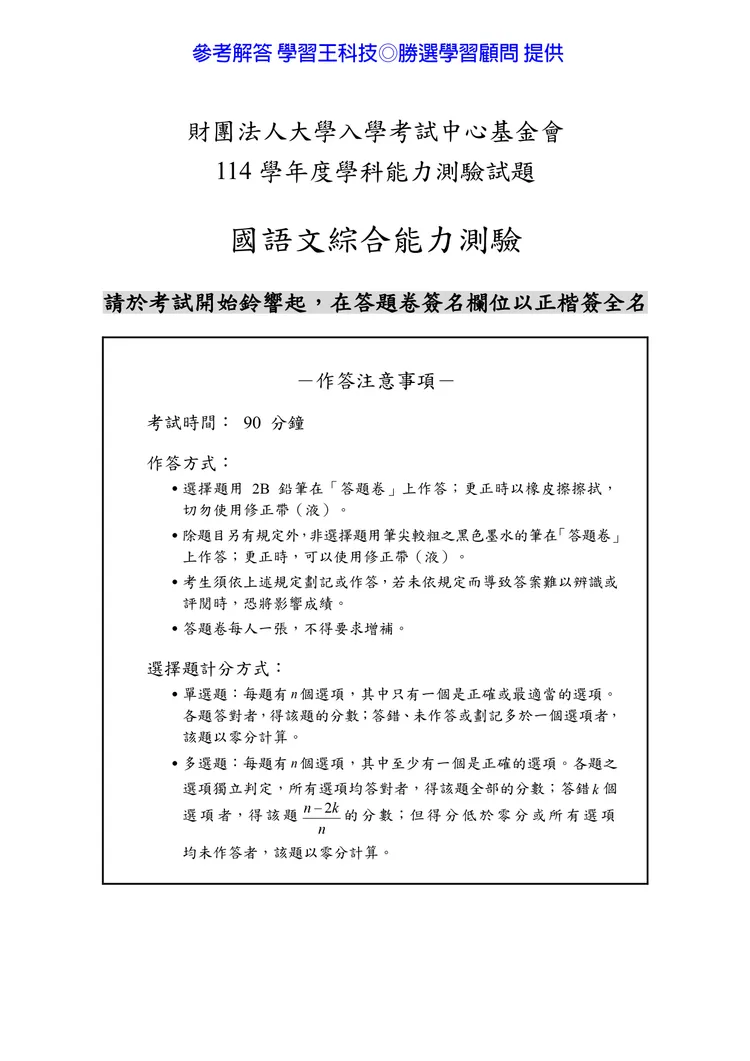 【記者黃泓哲/綜合報導】114年大學學測國文科考試已結束,大考中心公布題目,參考答案由學習王提供,正確答案仍以大考中心為準。