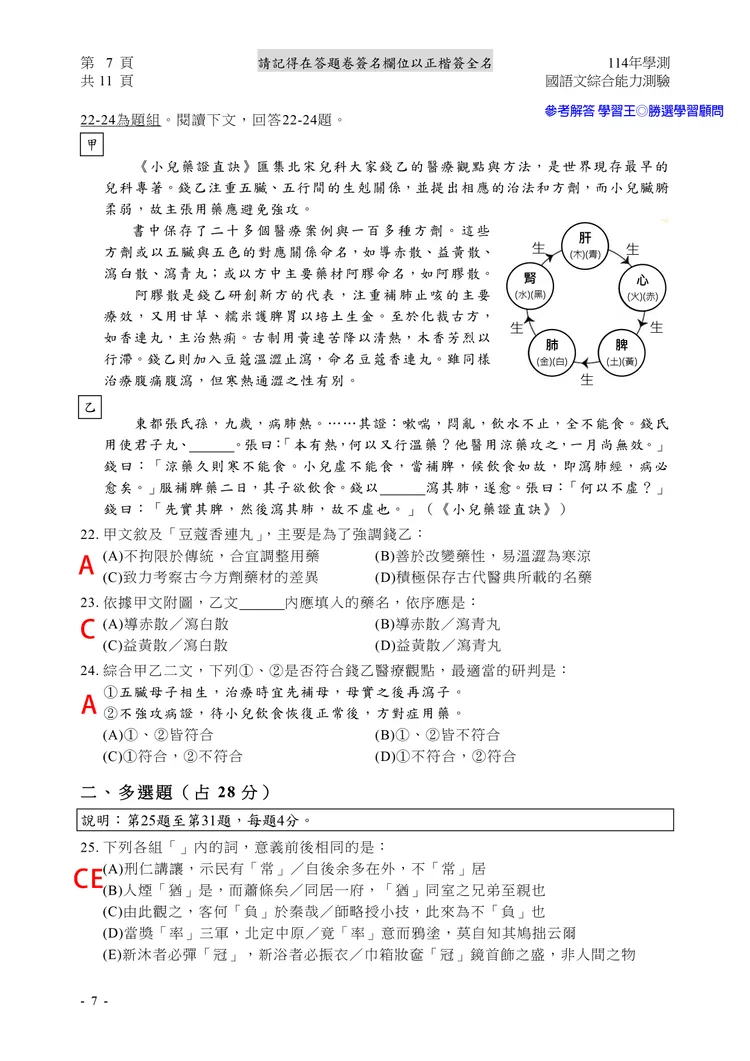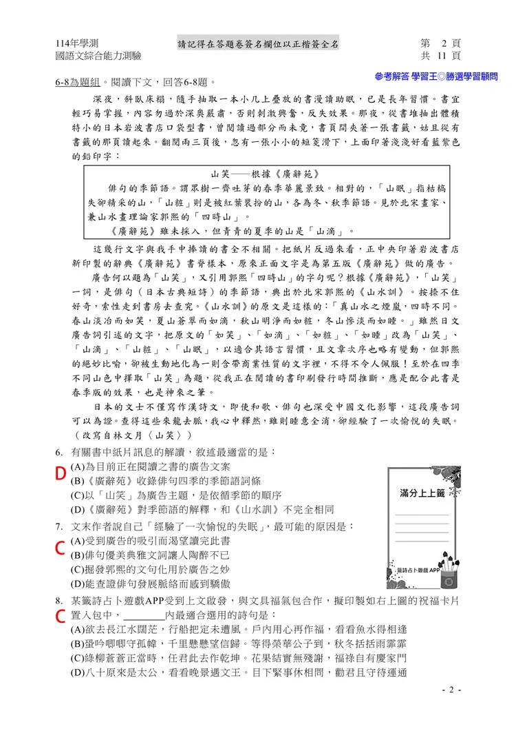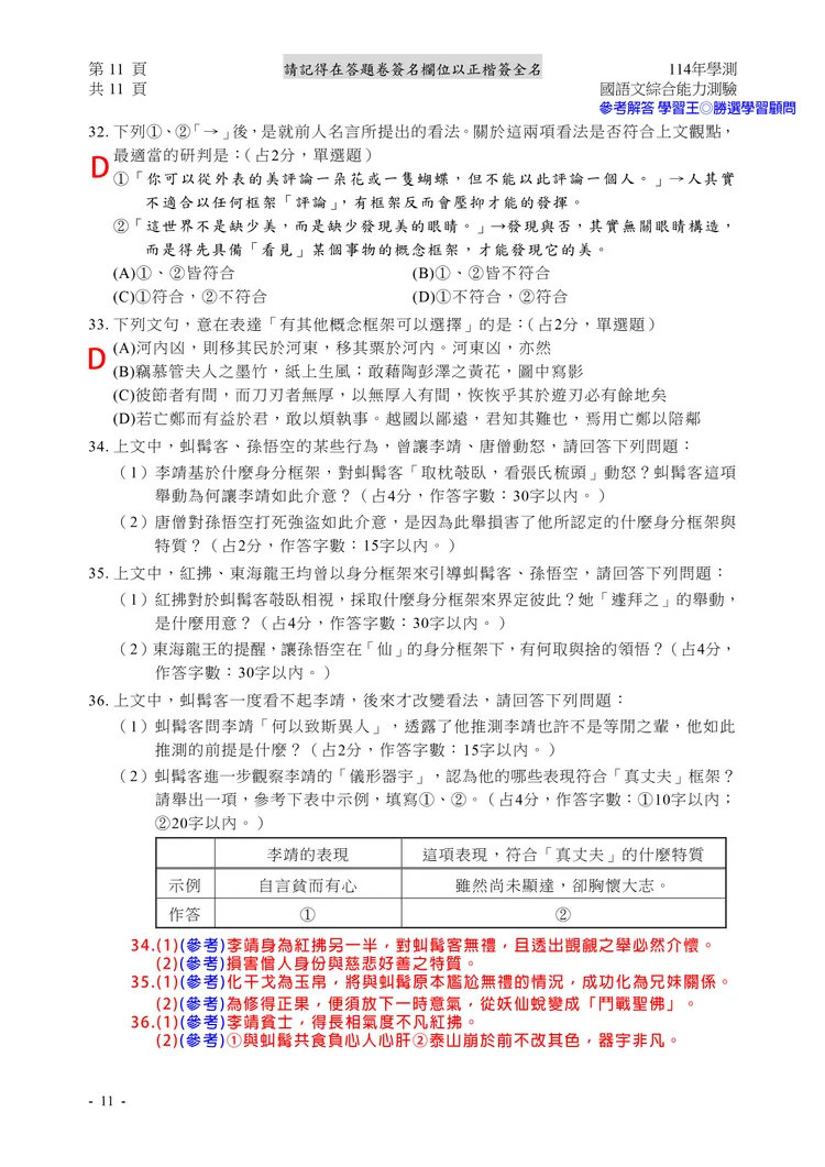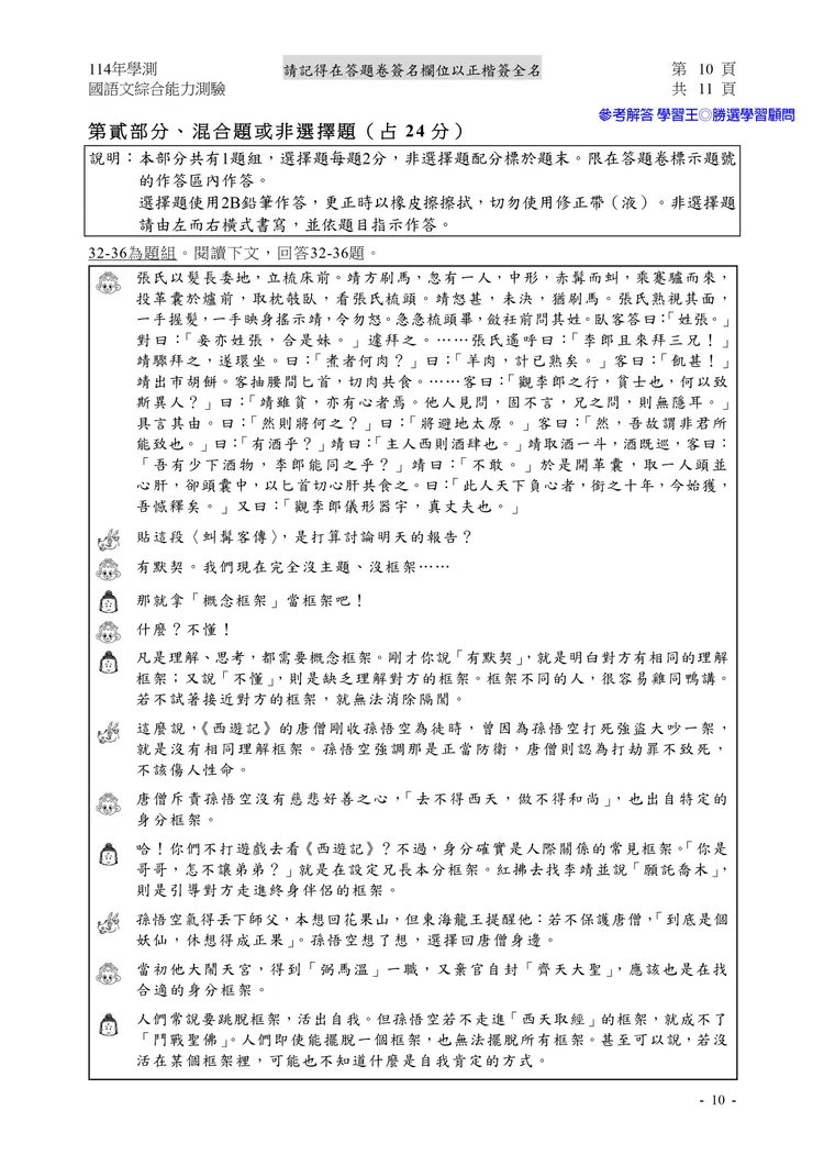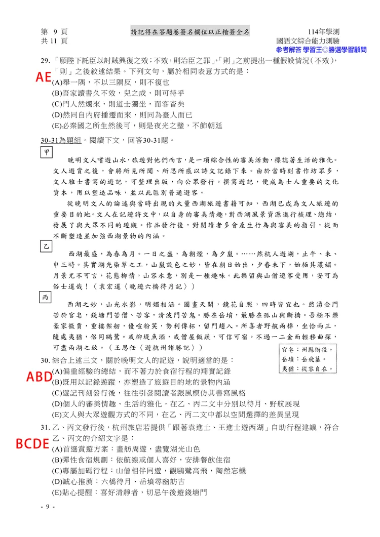 【記者黃泓哲/綜合報導】114年大學學測國文科考試已結束,大考中心公布題目,參考答案由學習王提供,正確答案仍以大考中心為準。