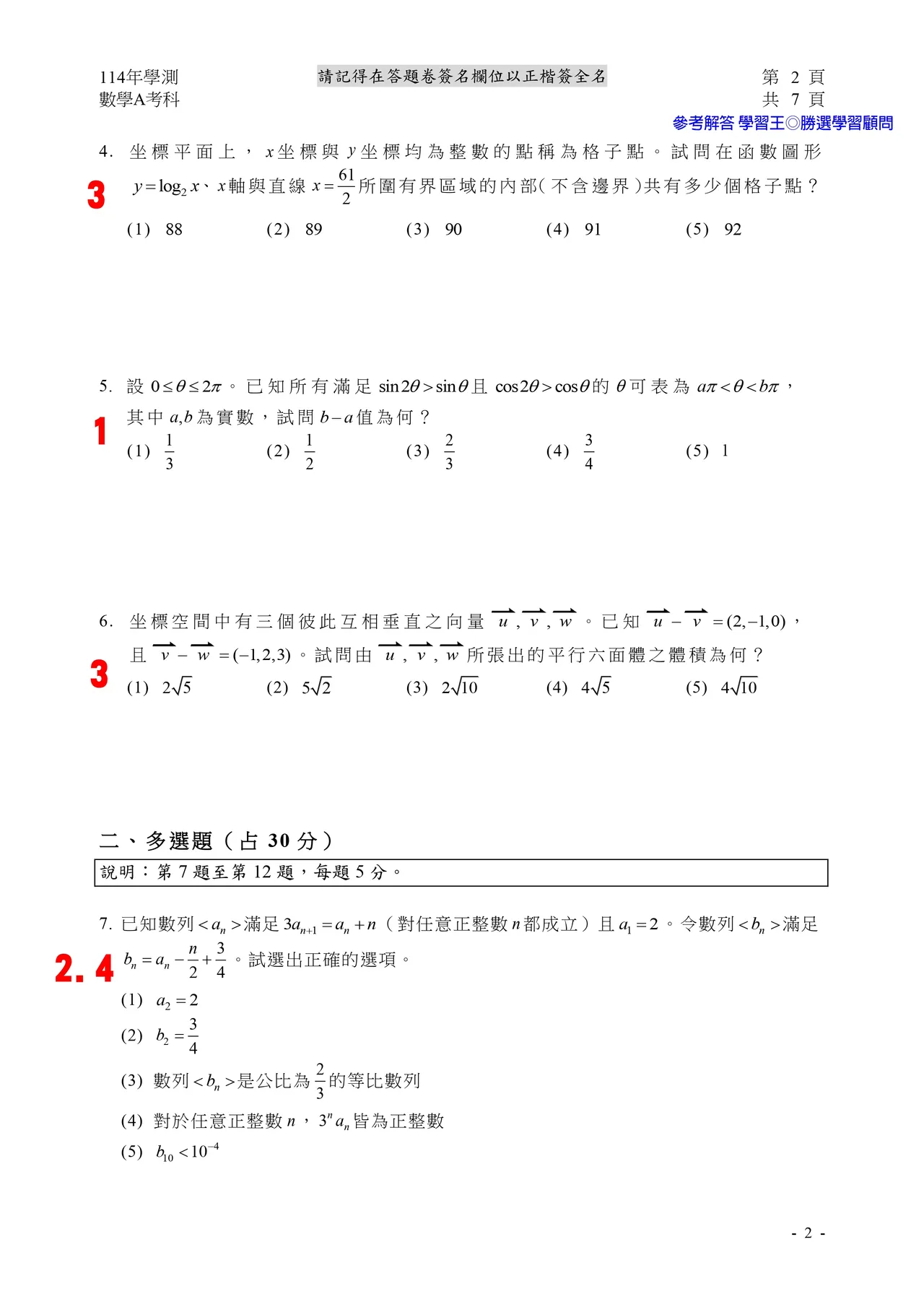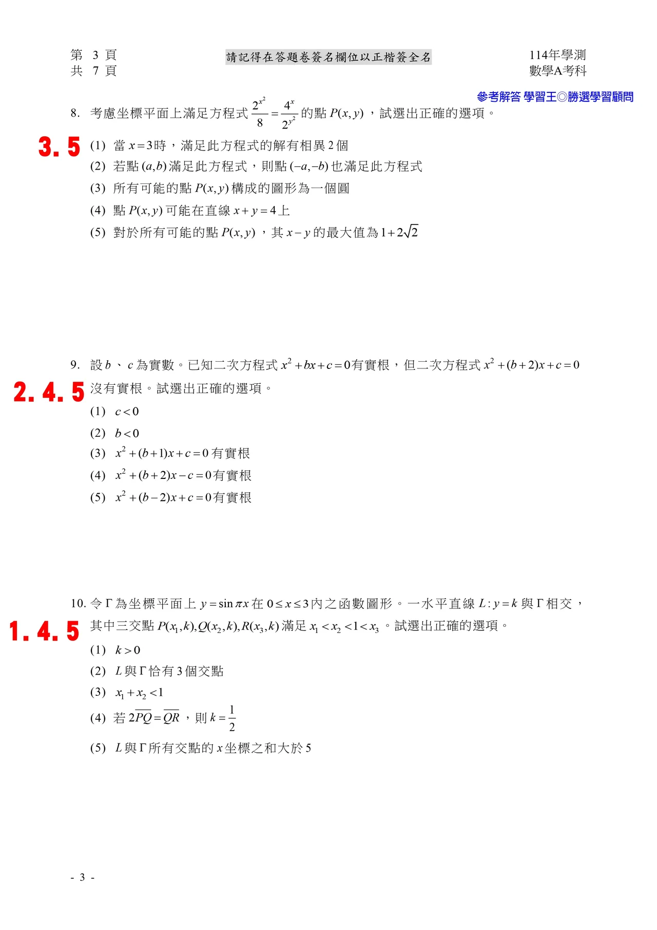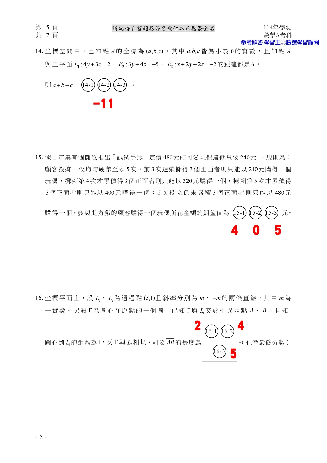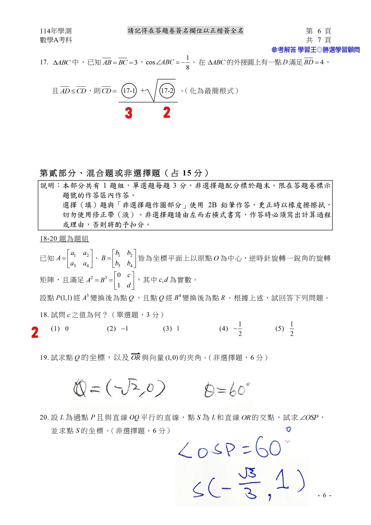 【記者黃泓哲/綜合報導】114年大學學測數學A科考試已結束,大考中心公布題目,參考答案由學習王提供,正確答案仍以大考中心為準。