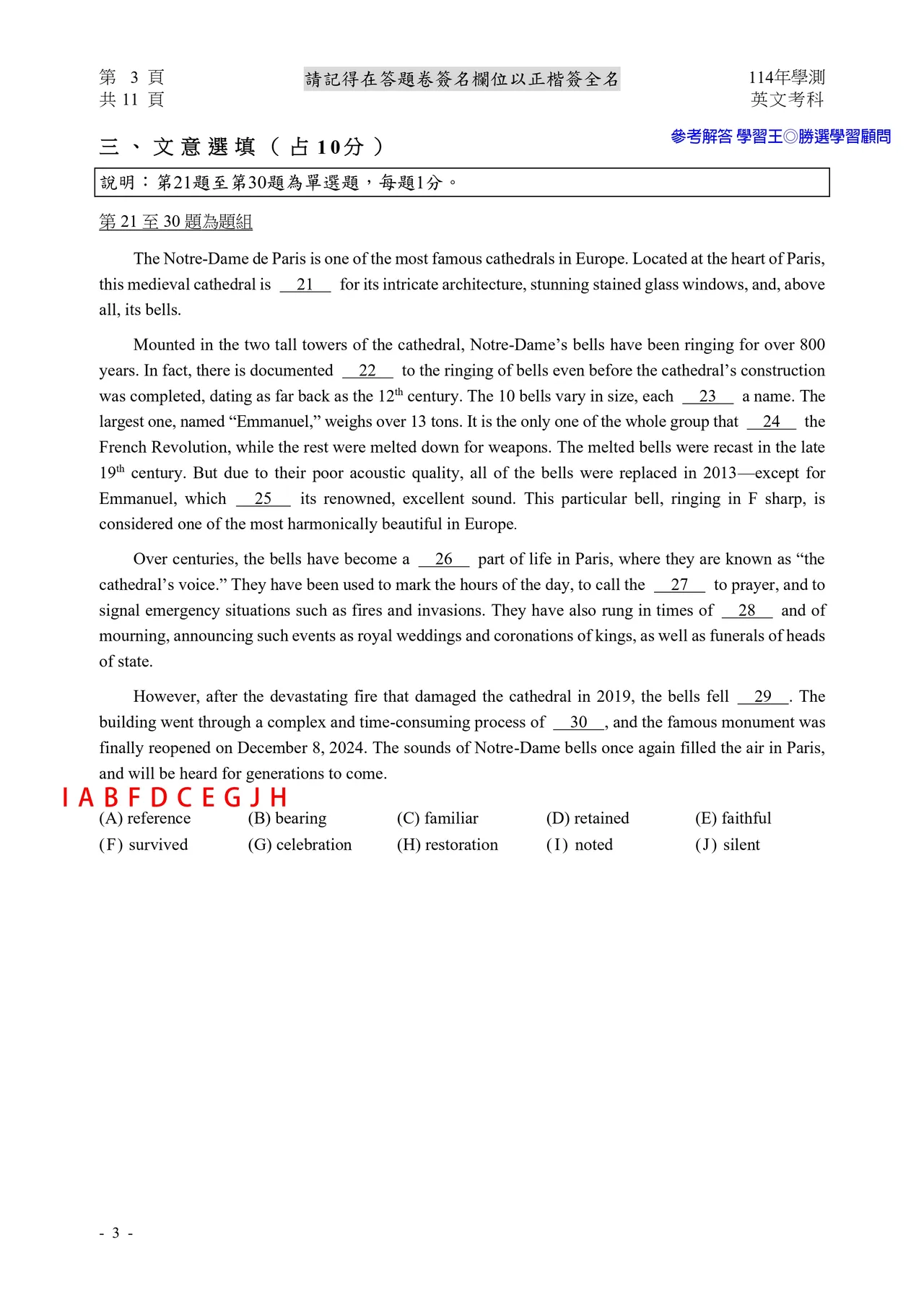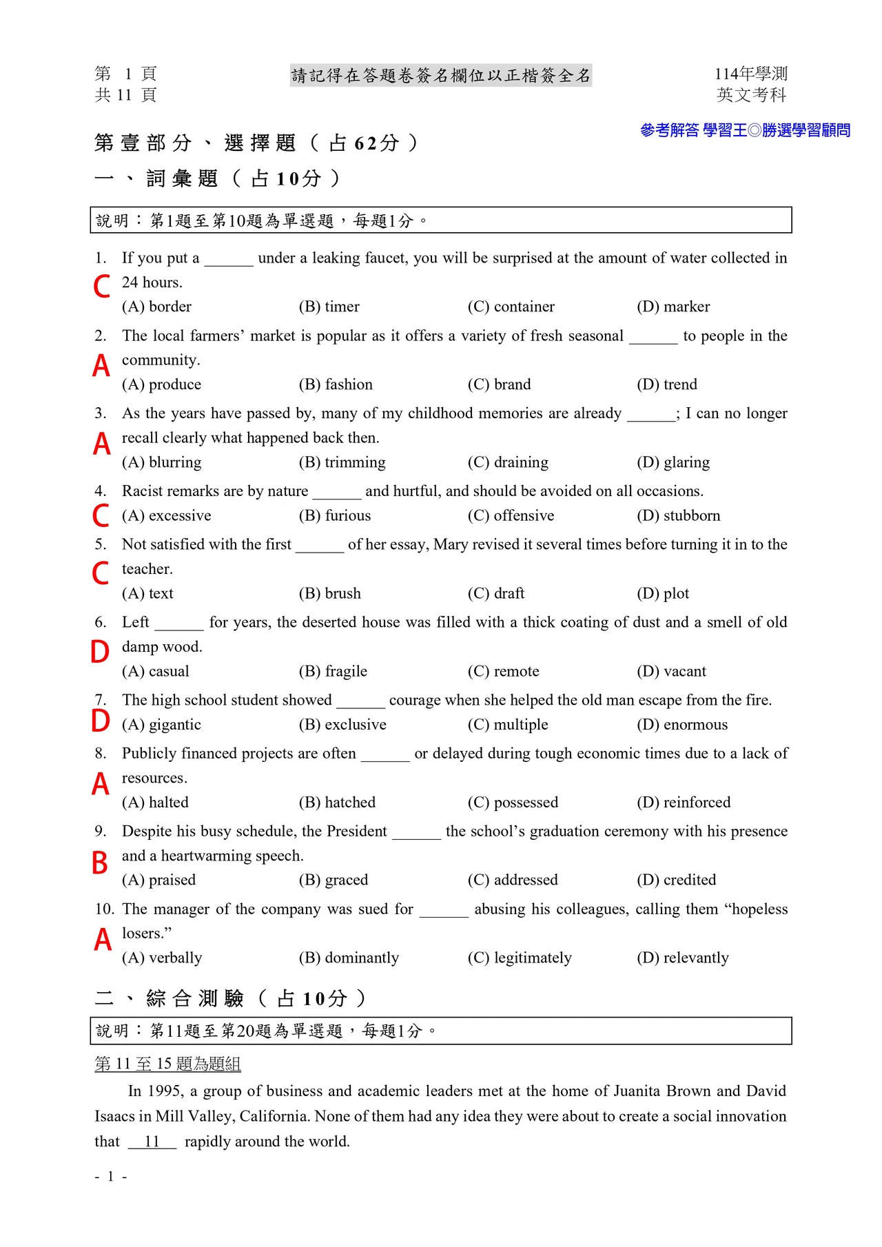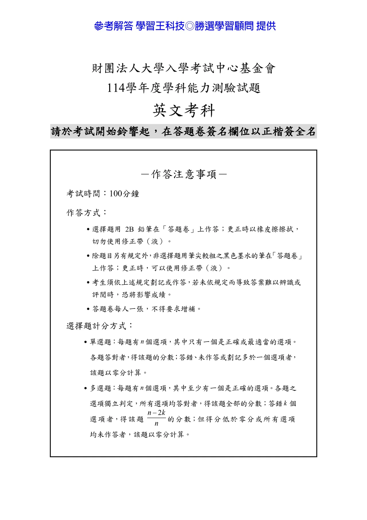 【記者黃泓哲/綜合報導】114年大學學測英文科考試上午結束,大考中心公布題目,參考答案由學習王提供,正確答案仍以大考中心為準。