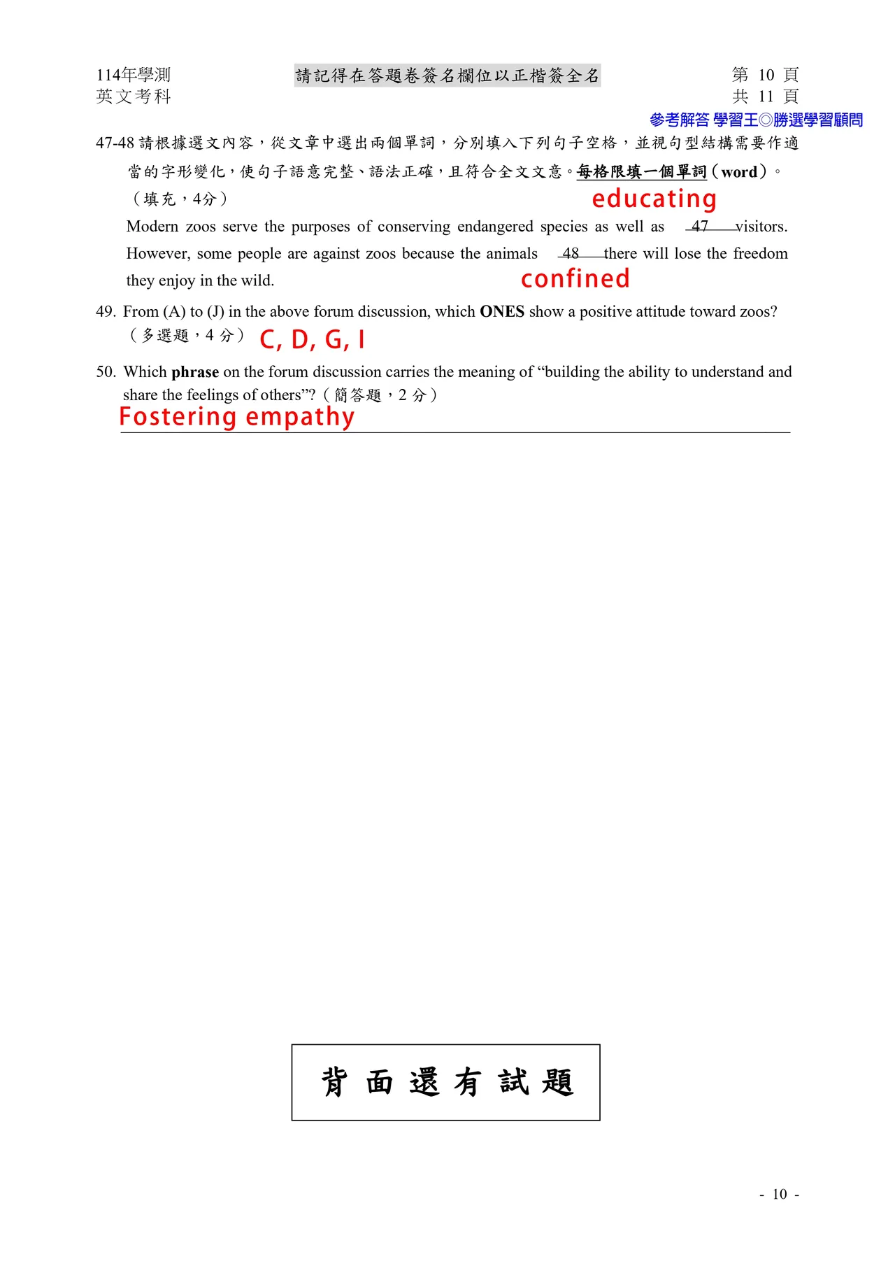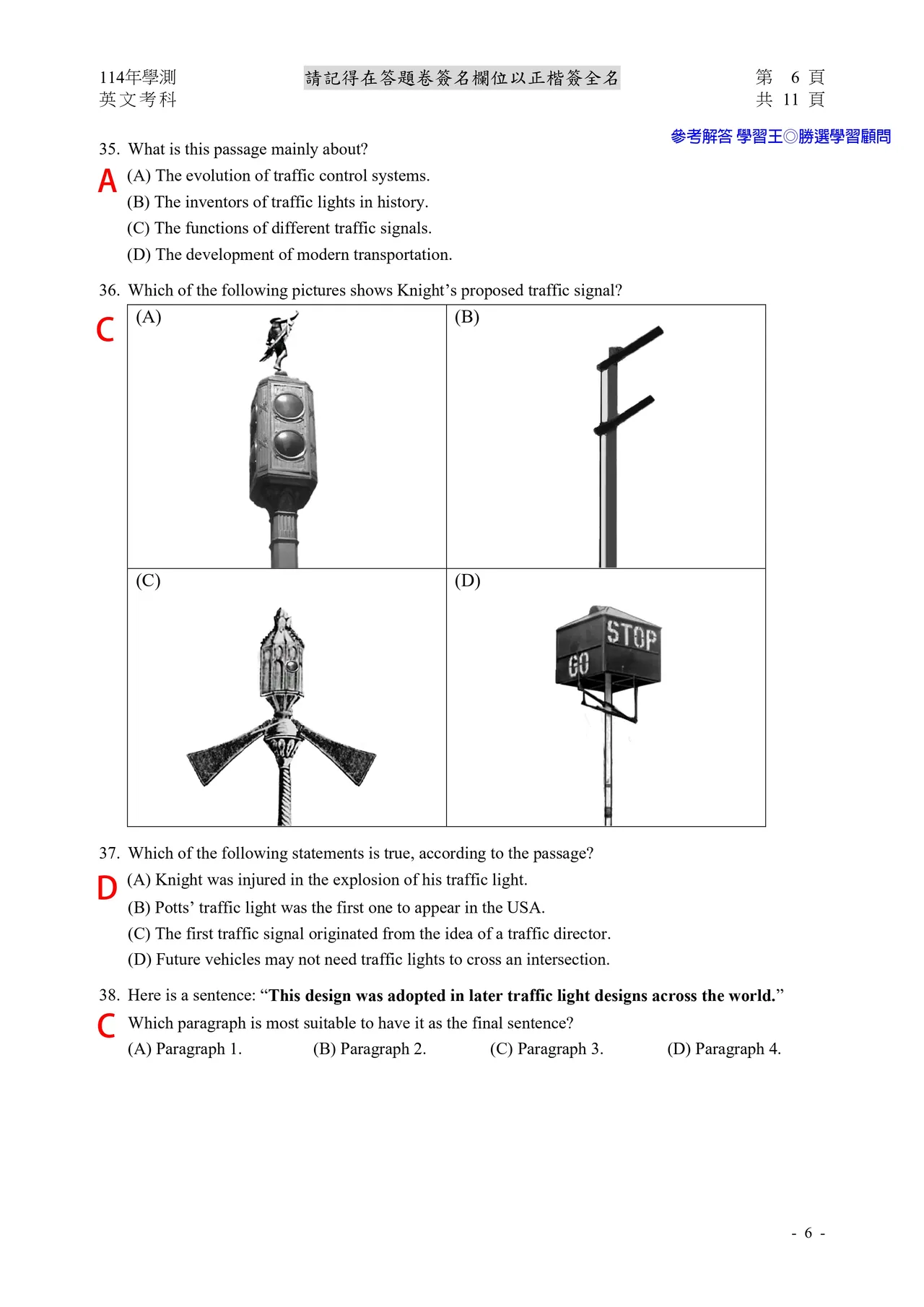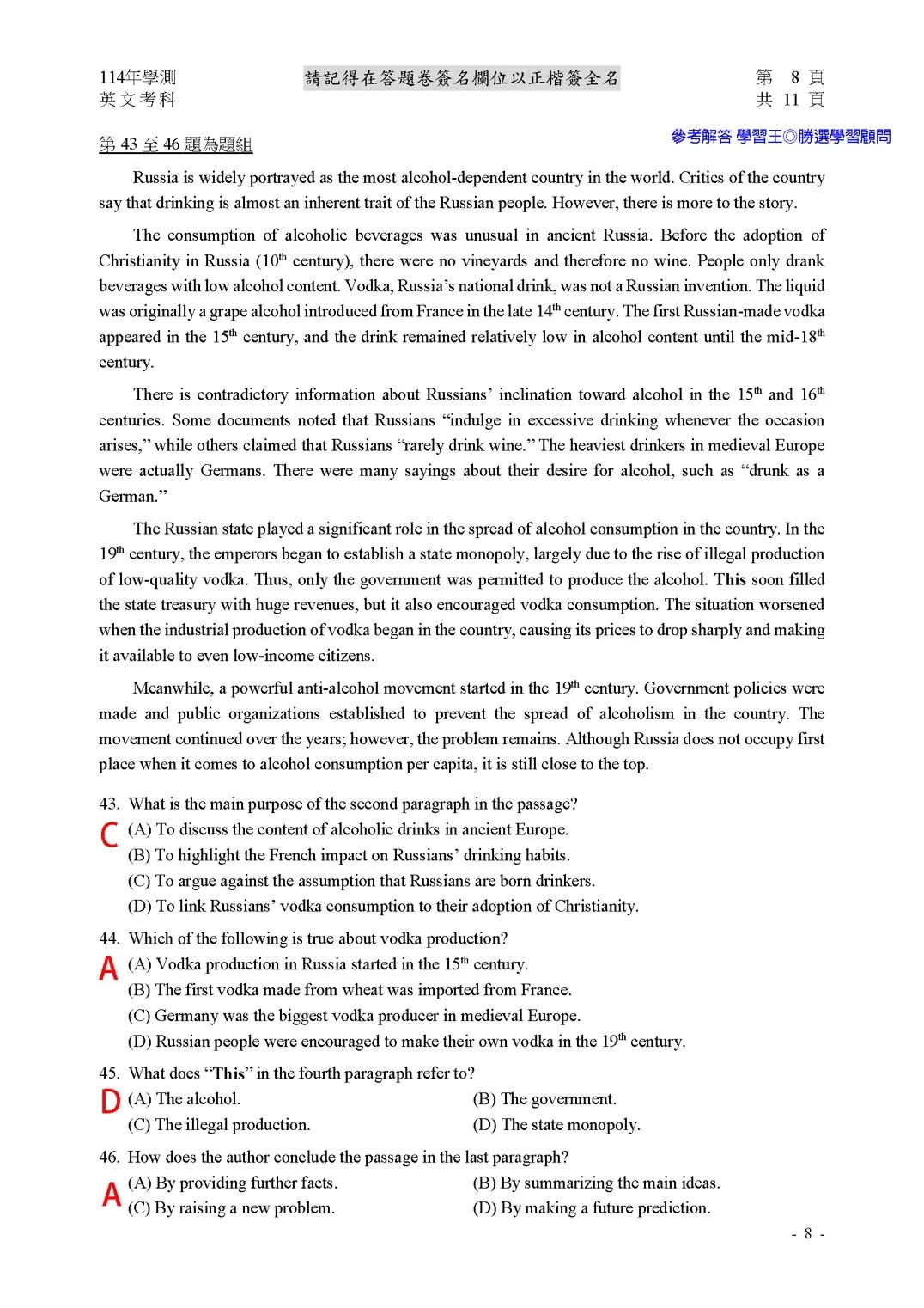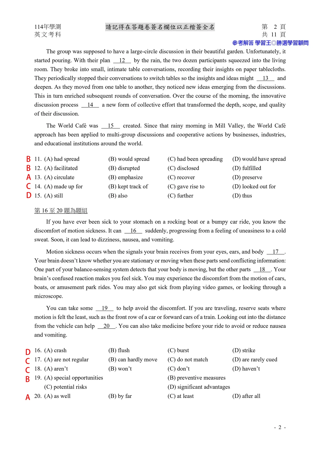 【記者黃泓哲/綜合報導】114年大學學測英文科考試上午結束,大考中心公布題目,參考答案由學習王提供,正確答案仍以大考中心為準。