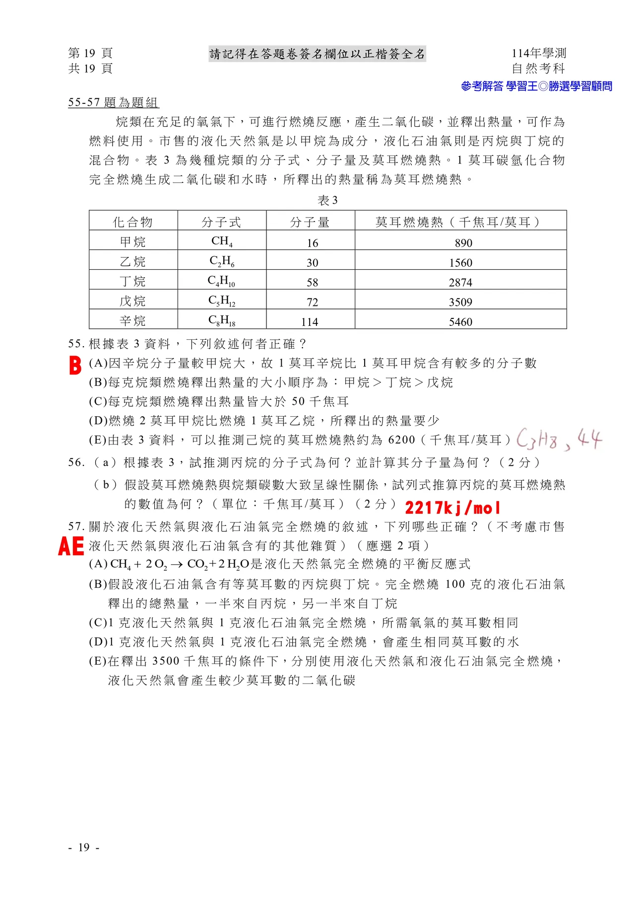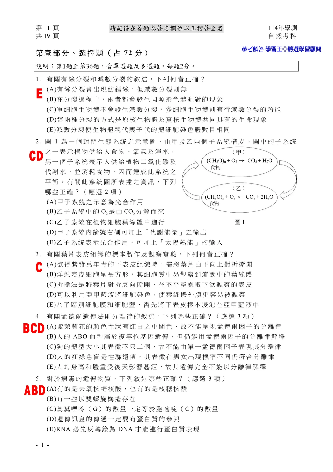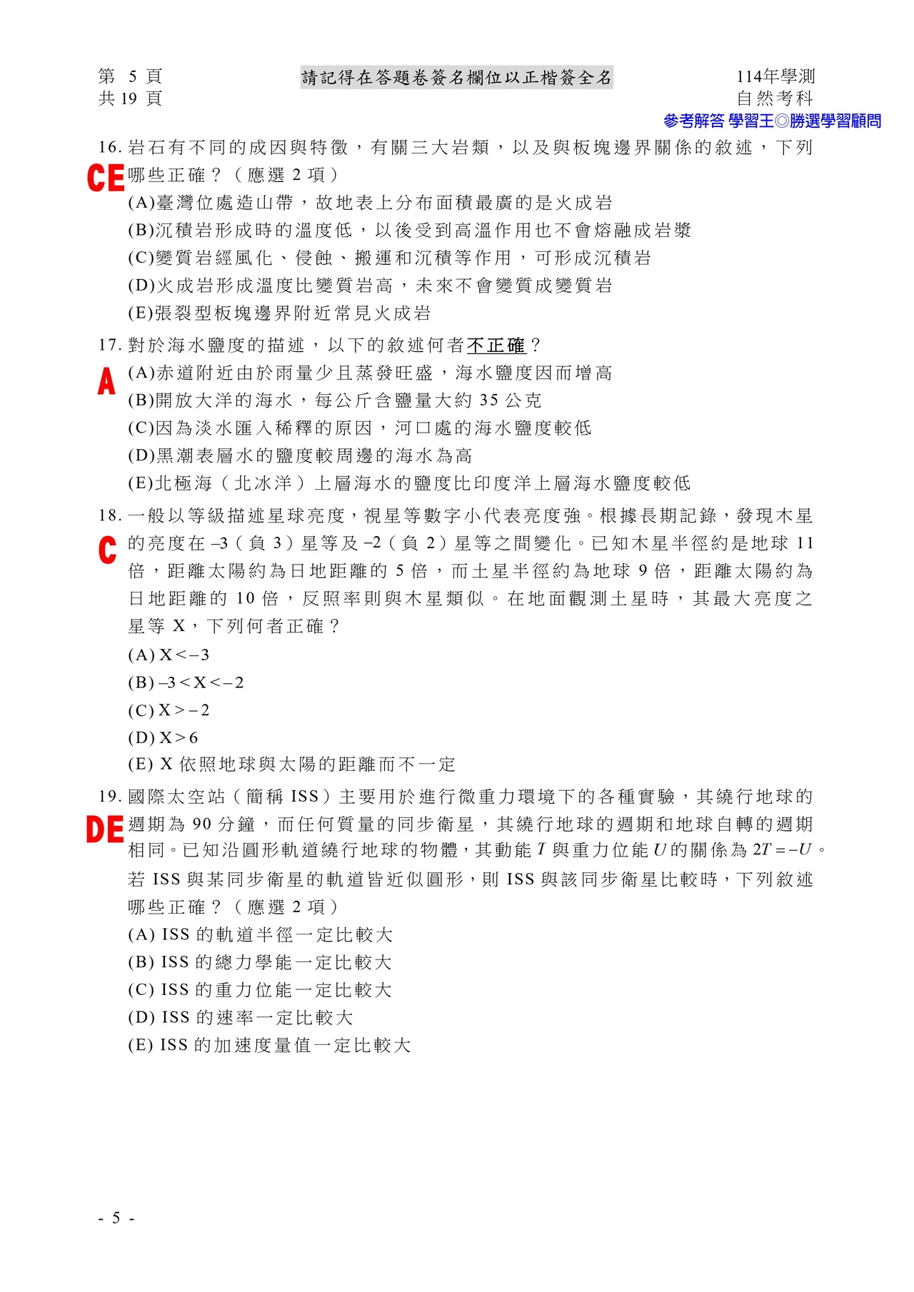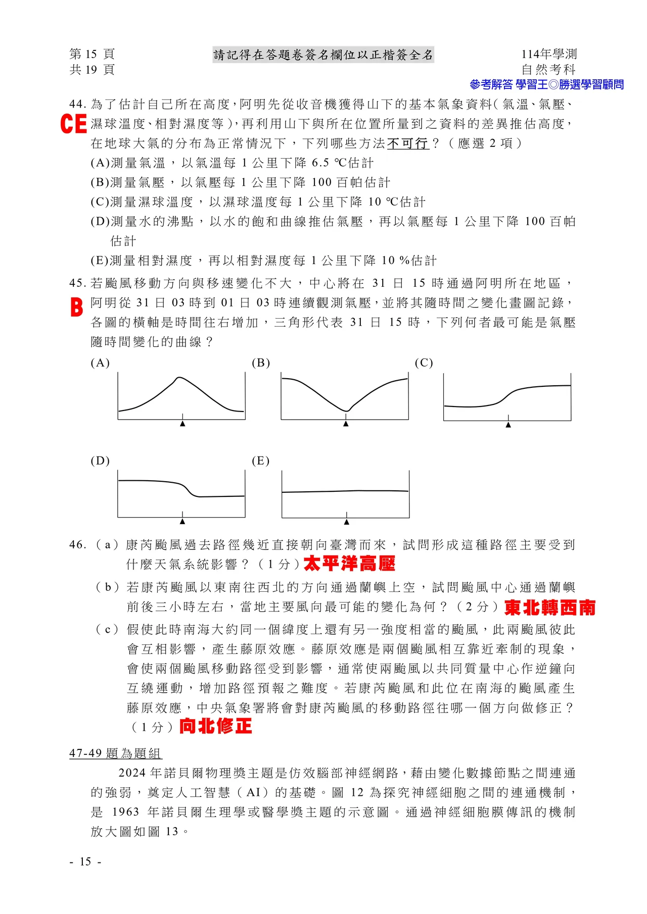 【記者黃泓哲/綜合報導】114年大學學測自然科考試已結束,大考中心公布題目,參考答案由學習王提供,正確答案仍以大考中心為準