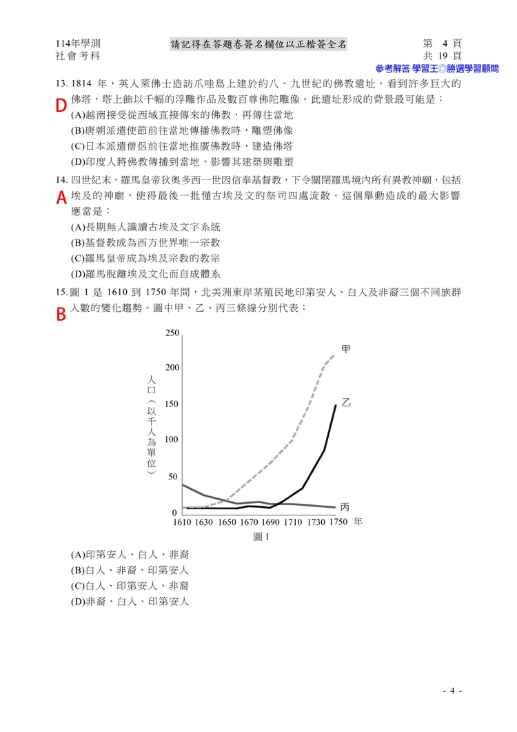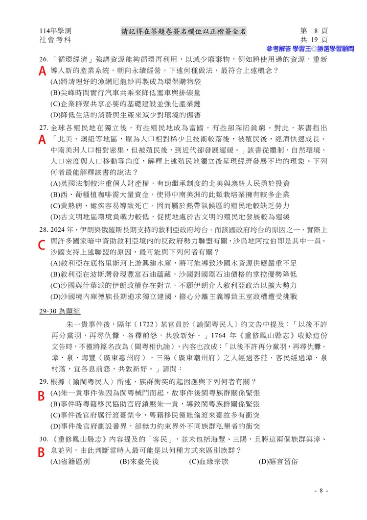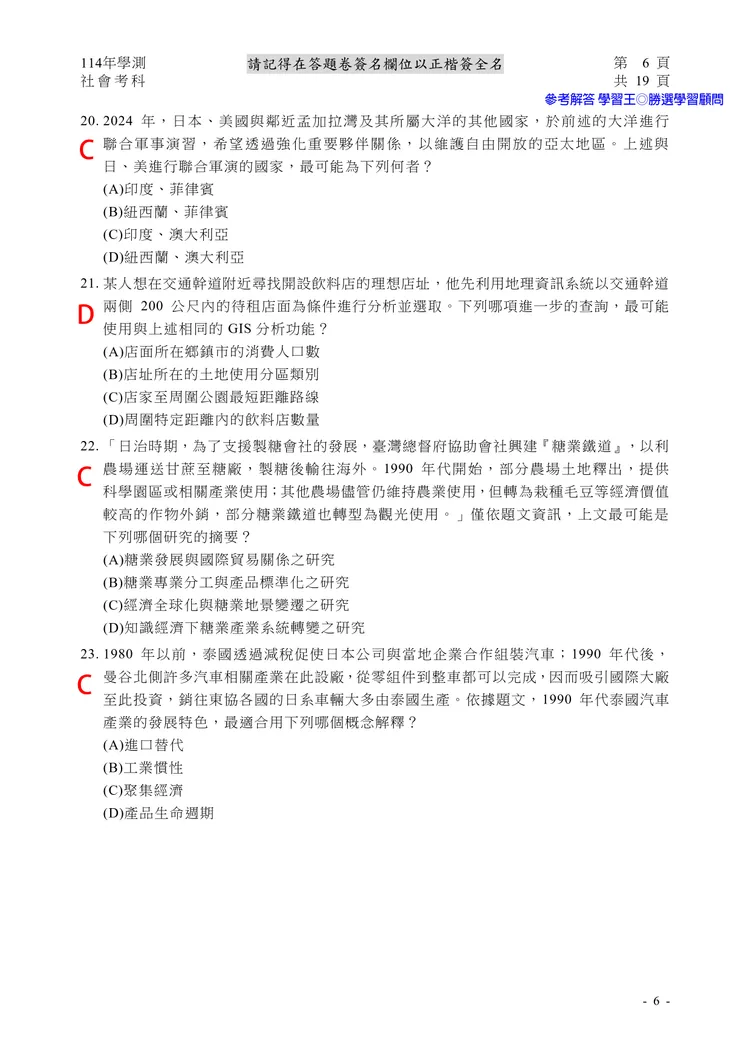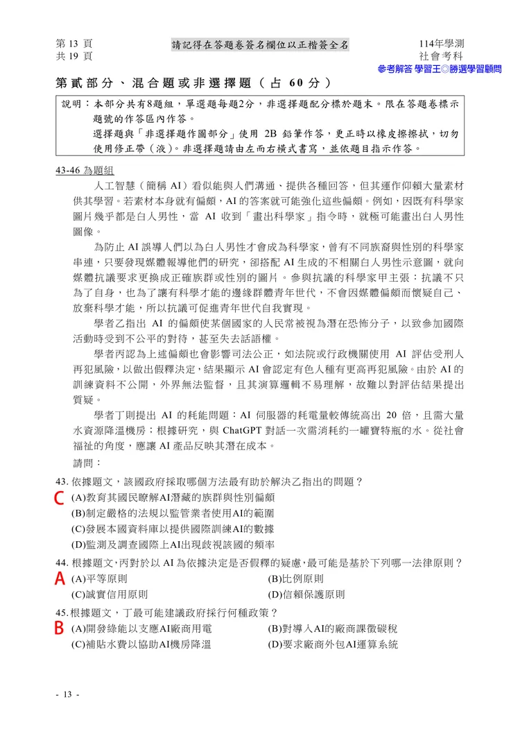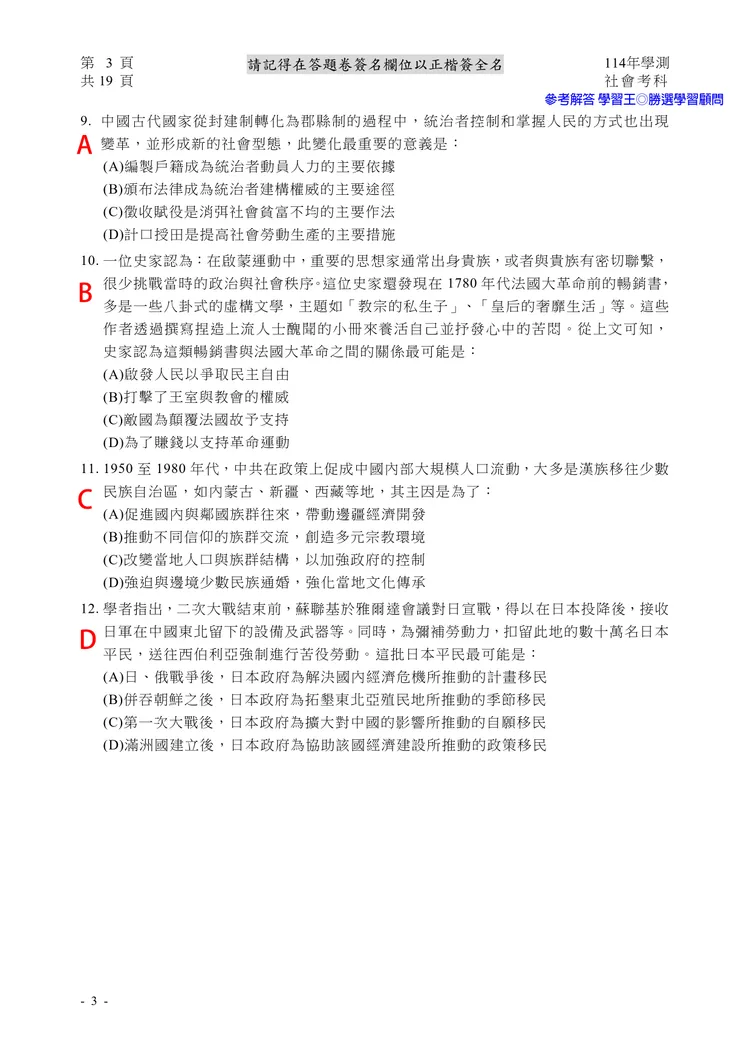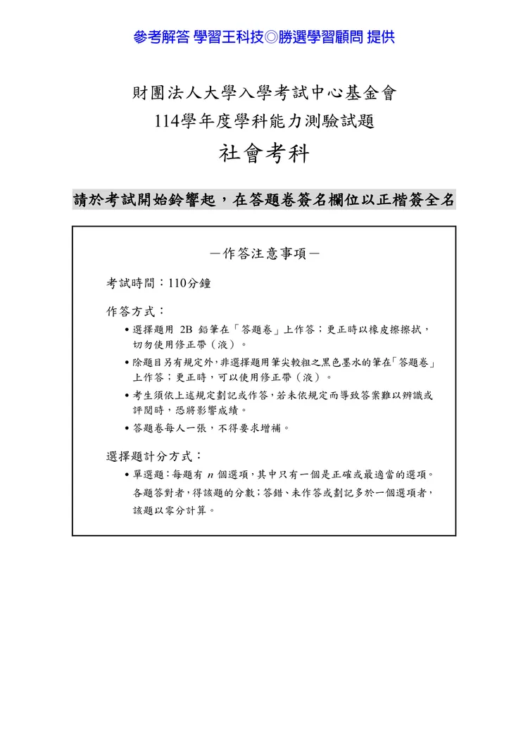 【記者黃泓哲/台北報導】】114年大學學測社會科考試已結束,大考中心公布題目,參考答案由學習王提供,正確答案仍以大考中心為準。