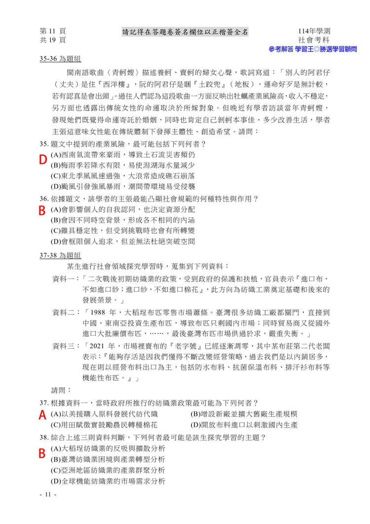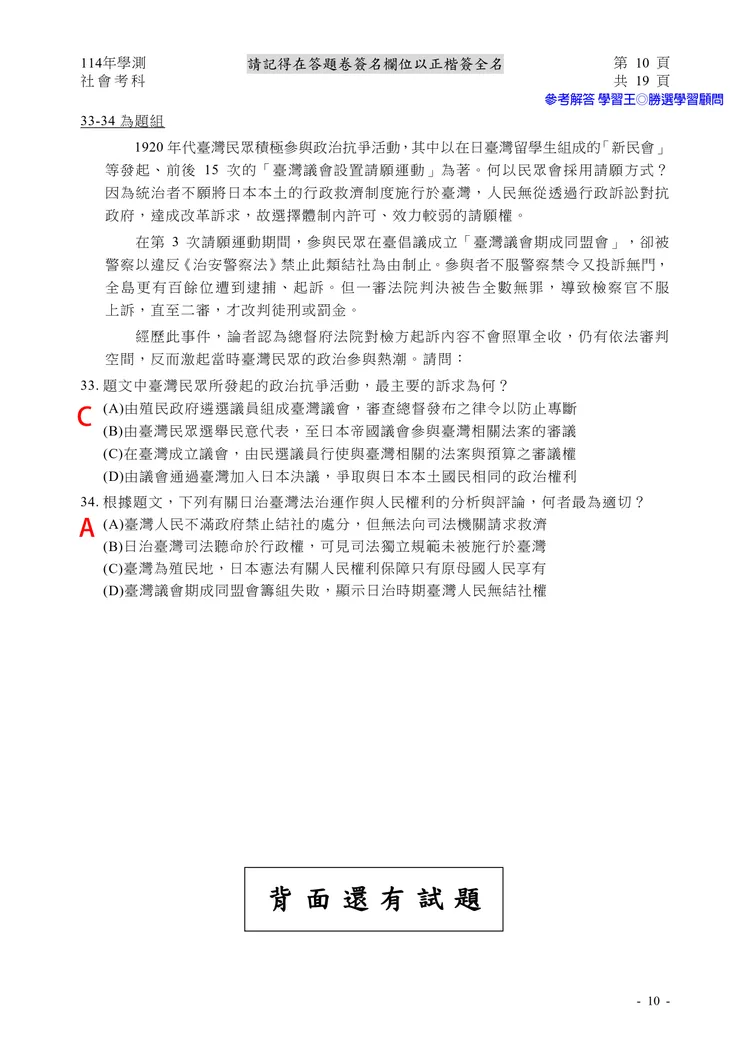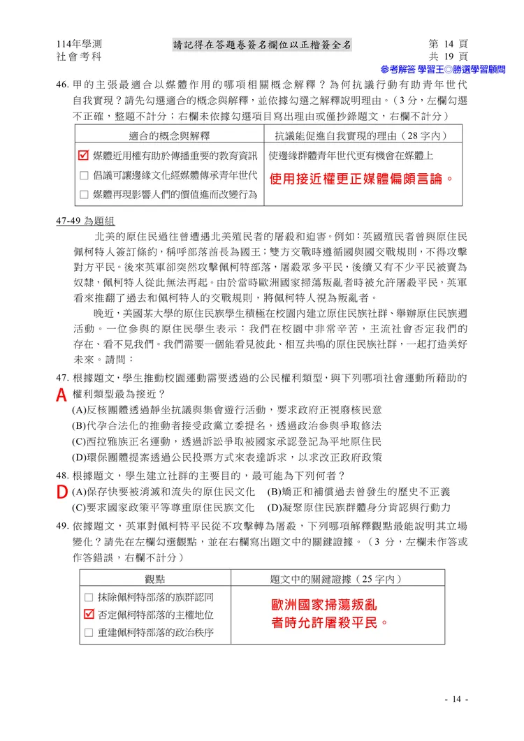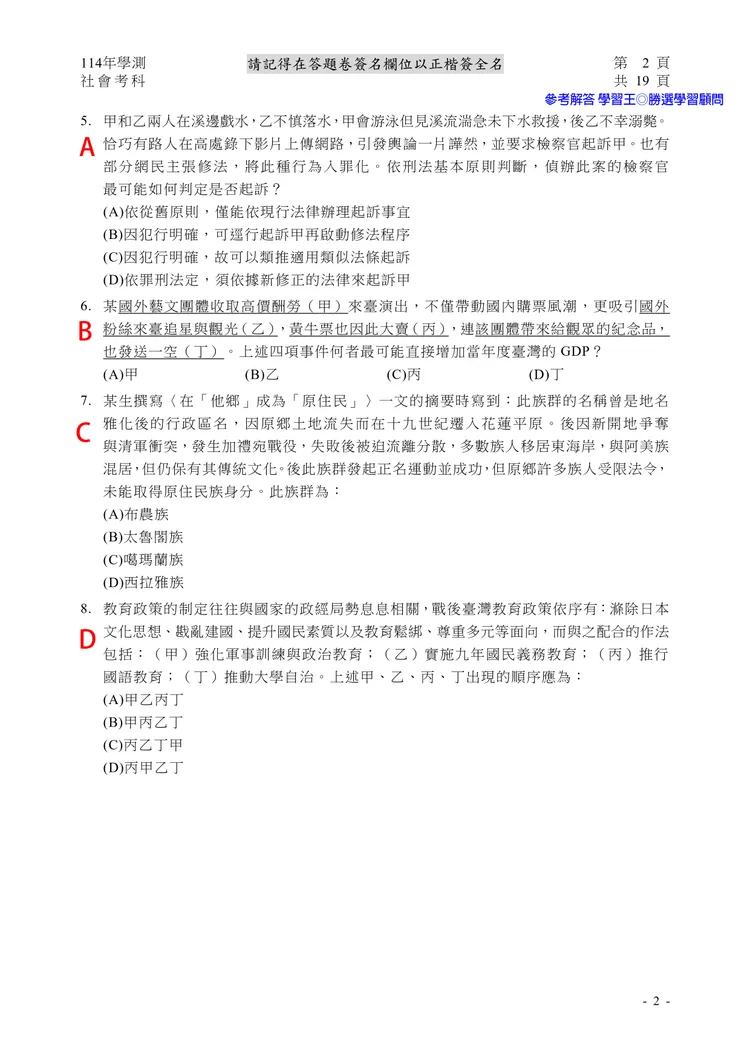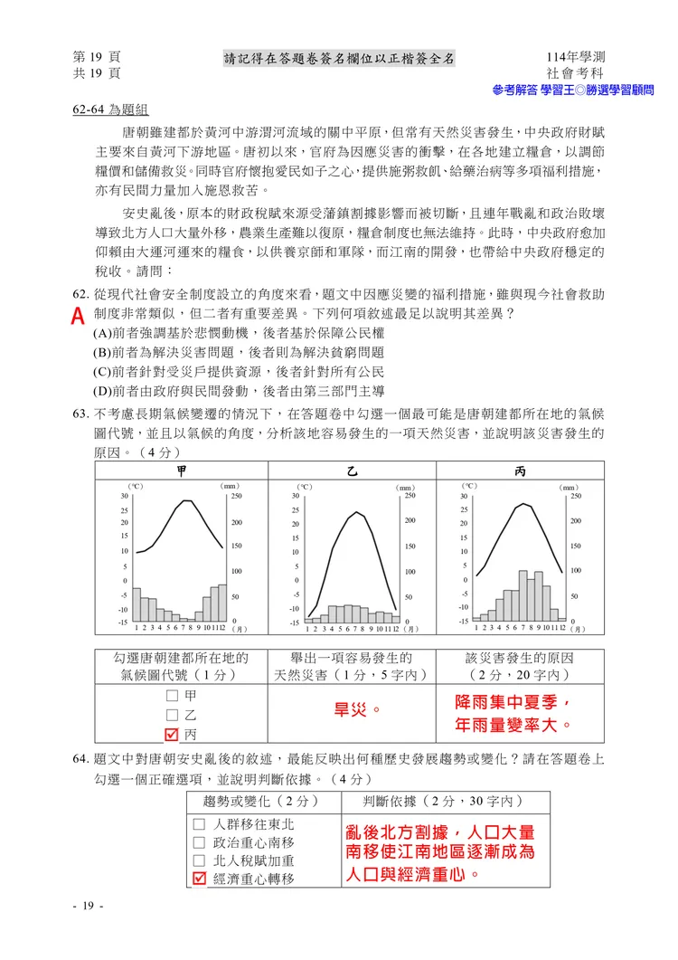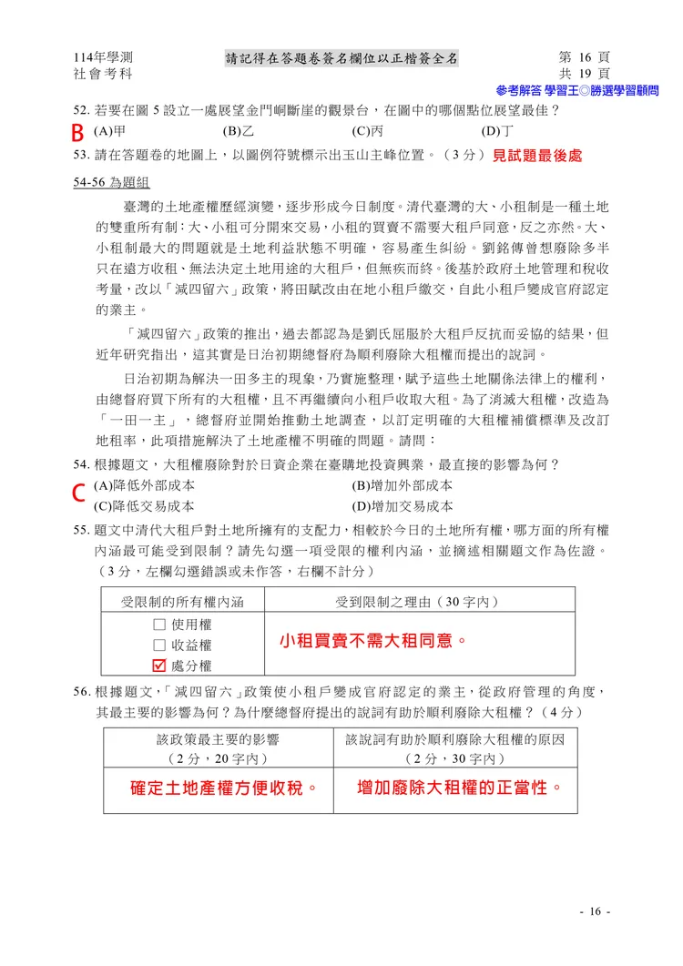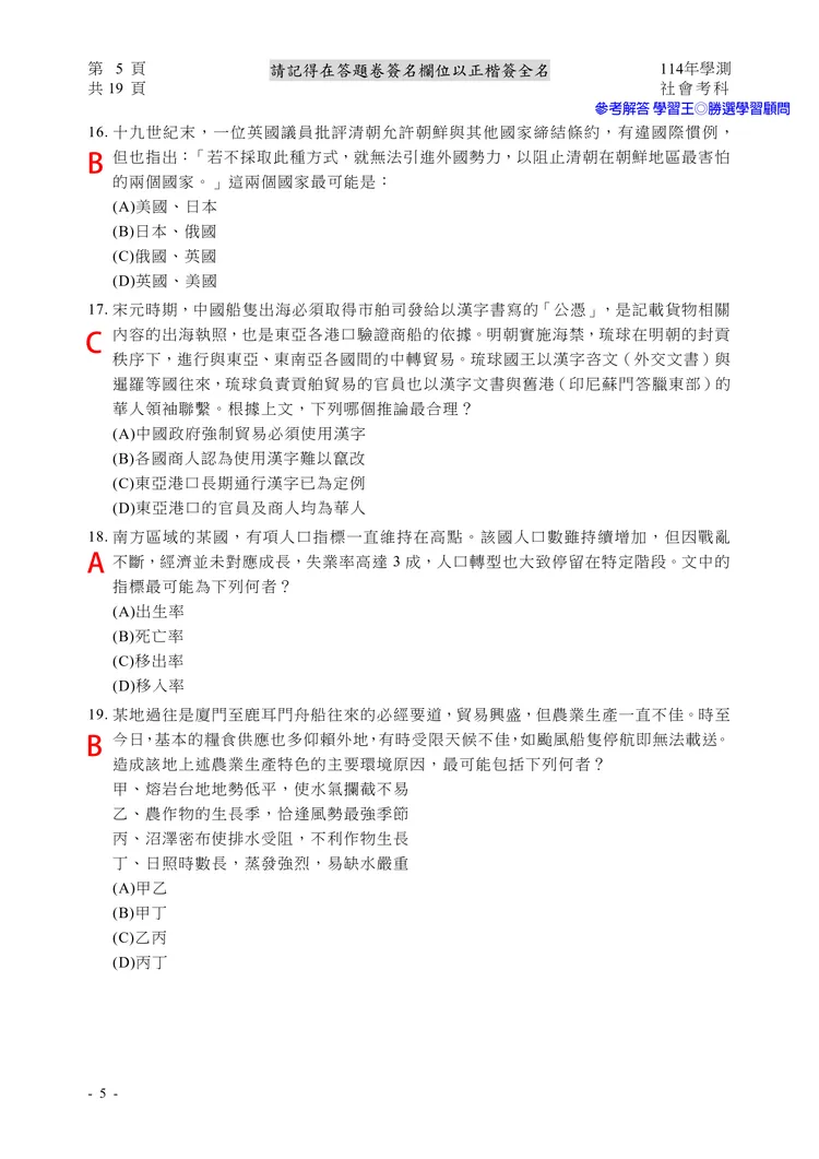 【記者黃泓哲/台北報導】】114年大學學測社會科考試已結束,大考中心公布題目,參考答案由學習王提供,正確答案仍以大考中心為準。