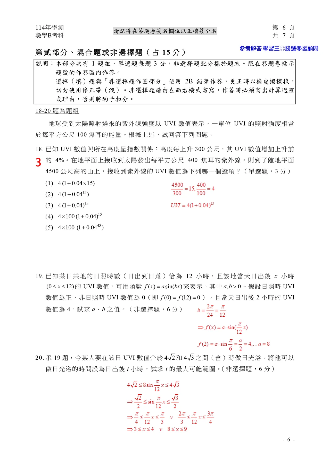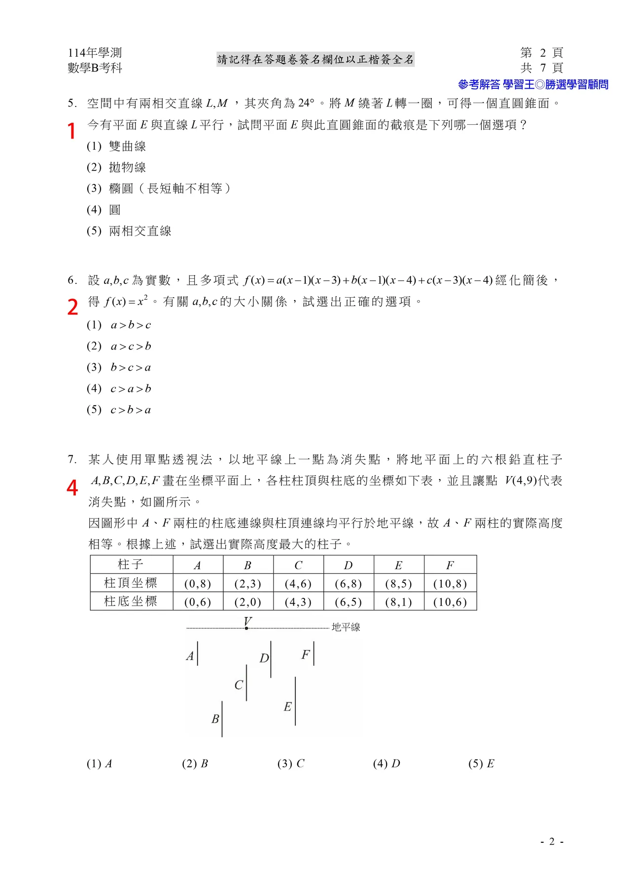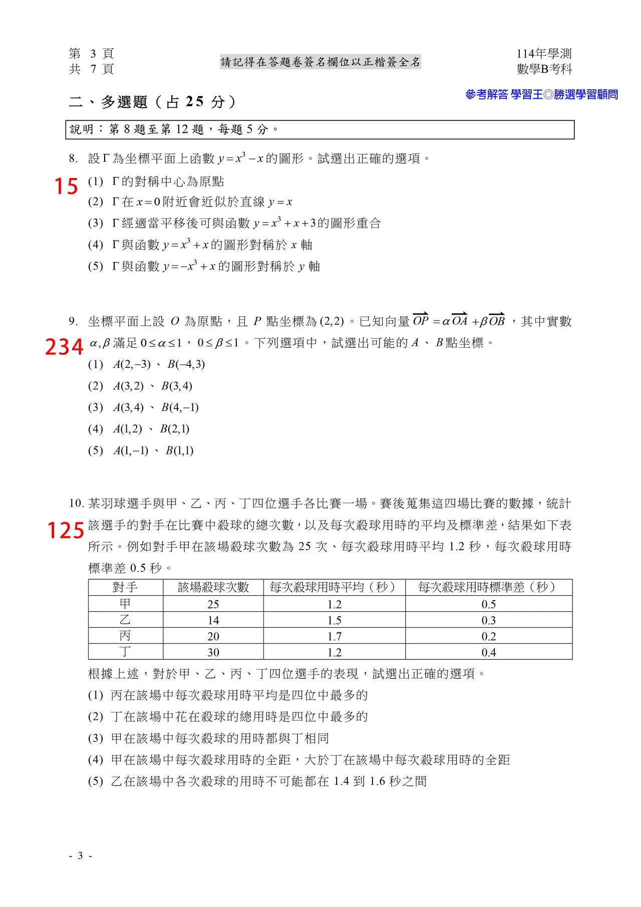【記者黃泓哲/台北報導】114年大學學測數學B考科科考試已結束,大考中心公布題目,參考答案由學習王提供,正確答案仍以大考中心為準