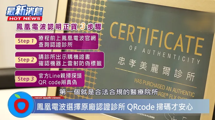 台灣微整形美容醫學會理事長陳美齡醫師,更進一步提醒,鳳凰電波可透過原廠認證機制,在療程前以官方LINE掃碼辨識真偽,但不肖廠商防偽技術日益更新,如果沒有官方LINE或辨識出來不是第一次的療程甚至非原廠正貨,就要小心。