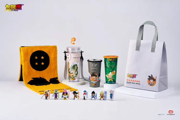 雙品牌也打造一系列聯名限定週邊,功夫茶獨家推出七龍珠「緹花毛巾」,龜記則推出「角色盲盒杯墊」,可搜集七龍珠大魔人氣角色;雙品牌同步販售「透明水壺組」,以神龍與超級賽亞人悟空為主視覺,搭配四星龍珠吸管塞與品牌印花杯提帶。