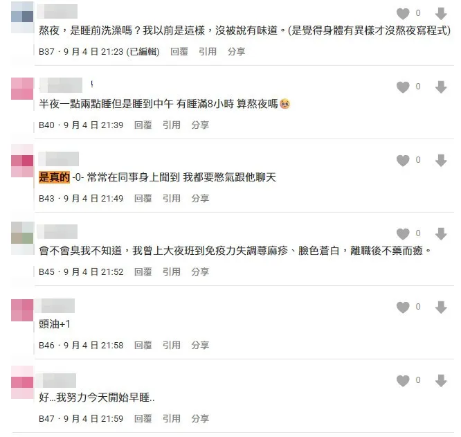 許多網友看了以後也紛紛驚呼:「我長期熬夜,有一次我朋友跟我說我身上有一股淡淡的腐爛味,但是是她抱著聞到我脖子的味道,我不相信給我同事聞,她認真聞了很久也覺得有一點點,我直接嚇爛,沖去健身,然後想辦法早點睡,我朋友聞已經說沒有了」、「那味道真的很臭,而且那不是口臭,是身體自己發出來的味道,會臭到在同一個空間就聞到」、「熬夜算是比較好分辨的,嗅覺比較敏感的人,還可以聞出一些身體狀況從感冒到帕金森氏症都會有些味道」、「難怪我男友這麼臭」、「我看了大家的留言,有些人是屍臭味、有些人是屎尿味(氨),有些人是口水味,看來每個人熬夜後排放的氣味不同,可能是體質問題。」