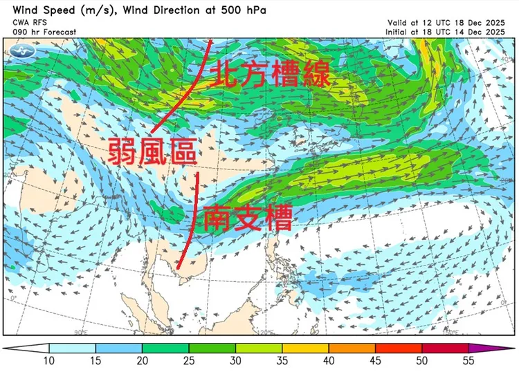 鄭明典在臉書說明,西風帶會隨季節南北移動,進入秋冬後,受到青藏高原地形影響,西風帶會一分為二,一支位於高原北側,另一支則在高原南方,形成所謂的「南支槽」。他指出,這種結構從風場圖來看比等高線更清楚,高原位置呈現弱風區,南北兩側則各有一支風速集中的西風帶。