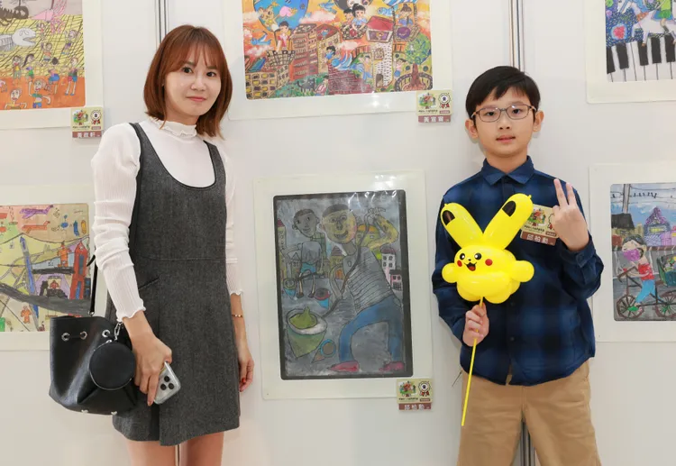 「陀螺是很傳統的節慶活動,我很喜歡,也希望畫下來讓更多人認識它!」來自高雄阿蓮國小的邱同學(右),以描繪打陀螺的場景,在黑色的底紙上,畫上黑色線條,營造出另一種的刻畫感,獲得金獎肯定,喜歡畫畫的他說,還會繼續參加比賽爭取榮耀;邱媽媽也說,從佳作到金獎,「國泰的比賽不僅讓孩子發揮創意,更激發榮譽心,往更好的舞台前進!」