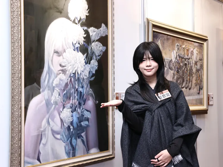 復興商工美術科三年級的曾歆甯,首度嘗試油畫就以作品〈寂語浮生〉獲得金獎肯定,「能在畢業前夕獲得獎項很高興,謝謝國泰看見了我。」在以冷調灰藍色描繪一個手捧白花的少女渴望呈現出隱藏情緒的作品中,她說白色的層次很難呈現,靠著查資料、詢問老師等方式來克服,所以這幅作品前後花了快一年的時間完成;首度參賽就獲大獎,她感謝國泰願意打造舞台,給喜歡畫畫的學生們,有展現自己的機會。