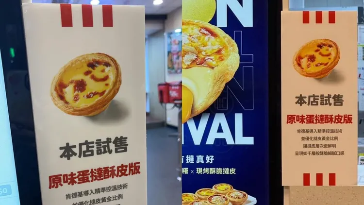 但有民眾發現部分肯德基門市搶先曝光新品,於自助點餐機旁可見擺放出「本店試售原味蛋撻酥皮版」的告示,並於說明中指出,導入精準控溫技術優化撻皮黃金比例,讓撻皮層次更鮮明,呈現如千層般酥脆細膩口感。